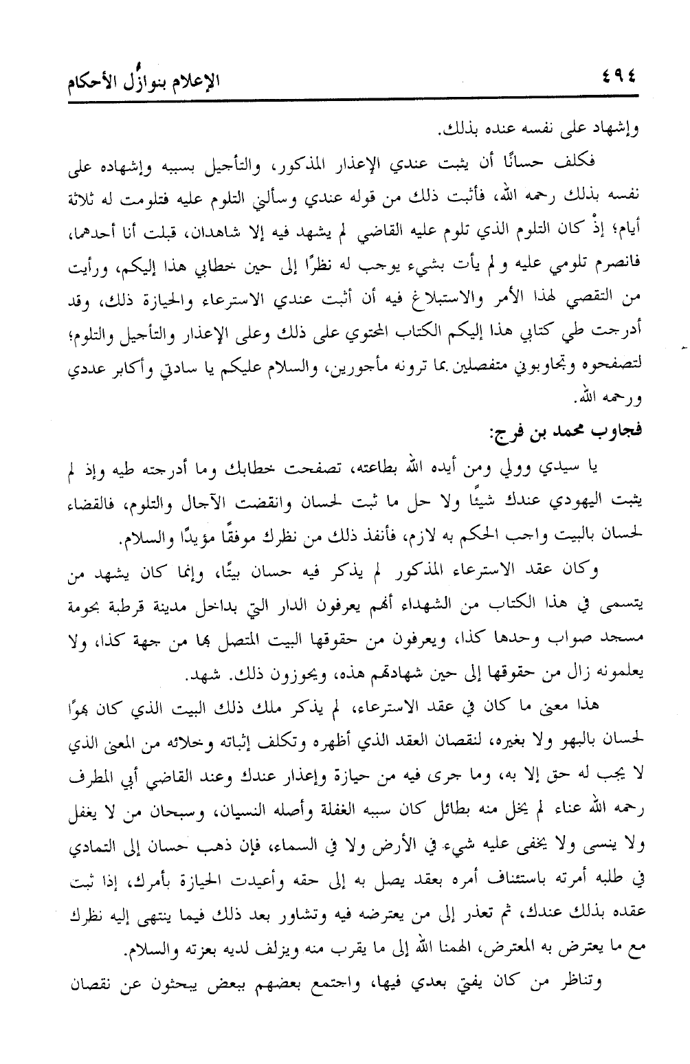 فكلف حسانًا أن يثبت عندي الإعذار المذكور، والتأجيل بسببه وإشهاده على نفسه بذلك رحمه الله، فأثبت ذلك من قوله عندي وسألني التلوم عليه فتلومت له ثلاثة أيام؛ إذ كان التلوم الذي تلوم عليه القاضي لم يشهد فيه إلا شاهدان، قبلت أنا أحدهما، فانصرم تلومي عليه ولم يأت بشيء يوجب له نظرًا إلى حين خطابي هذا إليكم، ورأيت من التقصي لهذا الأمر والاستبلاغ فيه أن أثبت عندي الاسترعاء والحيازة ذلك، وقد أدرجت طي كتابي هذا اليكم الكتاب المحتوي على ذلك وعلى الإعذار والتأجيل والتلوم؛ لتصفحوه وتجاوبوني منفصلين بما ترونه مأجورين، والسلام عليكم يا سادتي وأكابر عددي ورحمه الله.