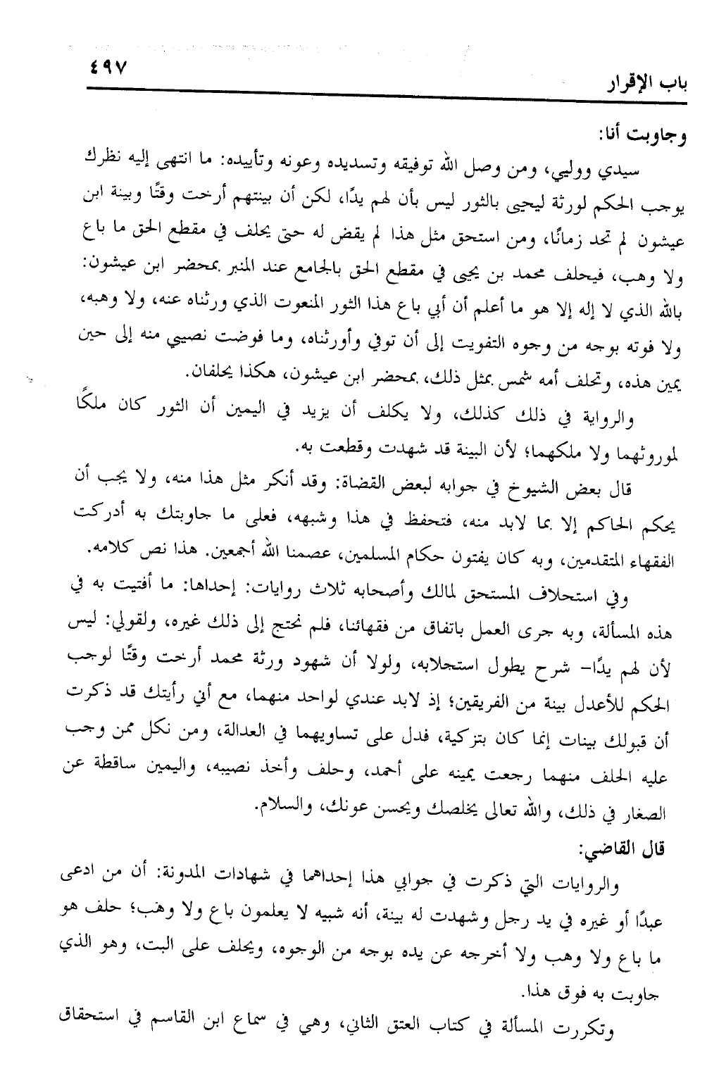 سيدي ووليي، ومن وصل الله توفيقه وتسديده وعونه وتأييده: ما انتهى إليه نظرك بوجب الحكم لورثة ليحيى بالثور ليس بأن لهم يدًا، لكن أن بينتهم أرخت وقتًا وبينة ابن عيشون لم تحد زمانًا، ومن استحق مثل هذا لم يقض له حتى يحلف في مقطع الحق ما باع ولا وهب، فيحلف محمد بن يحيى في مقطع الحق بالجامع عند المنير بمحضر ابن عيشون: بالله الذي لا إله إلا هو ما أعلم أن أبي باع هذا الثور المنعوت الذي ورثناه عنه، ولا وهبه، ولا فوته بوجه من وجوه التفويت إلى أن تفي وأورثناه، وما فوضت نصيبي منه إلى حين يمين هذه، وتحلف أمه شمس بمثل ذلك، بمحضر ابن عيشون، هكذا يحلفان.