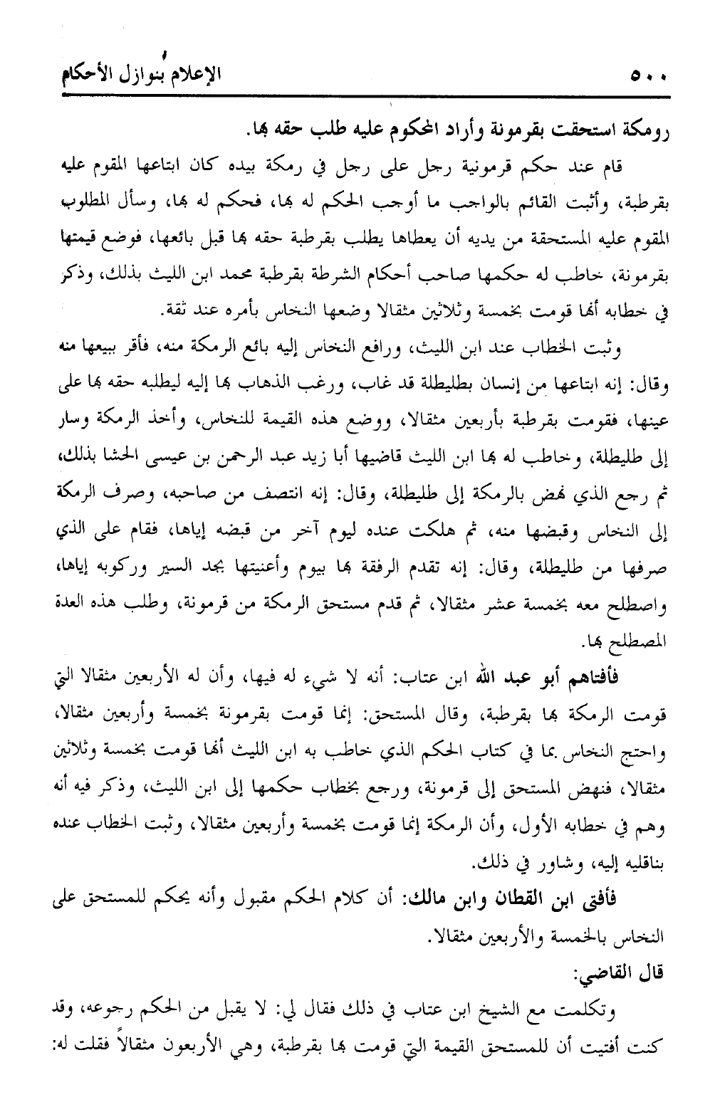 فأفتاهم أبو عبد الله بن عتاب: أنه لا شيء له فيها، وأن له الأربعين مثقالا التي قومت الرمكة بها بقرطبة، وقال المستحق: إنما قومت بقرمونة بخمسة وأربعين مثقالاً، واحتج النخاس بما في كتاب الحكم الذي خاطب به ابن الليث أنها قومت بخمسة وثلاثين مثقالا، فنهض المستحق إلى قرمونة، ورجع بخطاب حكمها إلى ابن الليث، وذكر فيه أنه وهم في خطابه الأول، وأن الرمكة إنما قومت بخمسة وأربعين مثقالا، وثبت الخطاب عنده بناقليه إليه، وشاور في ذلك.