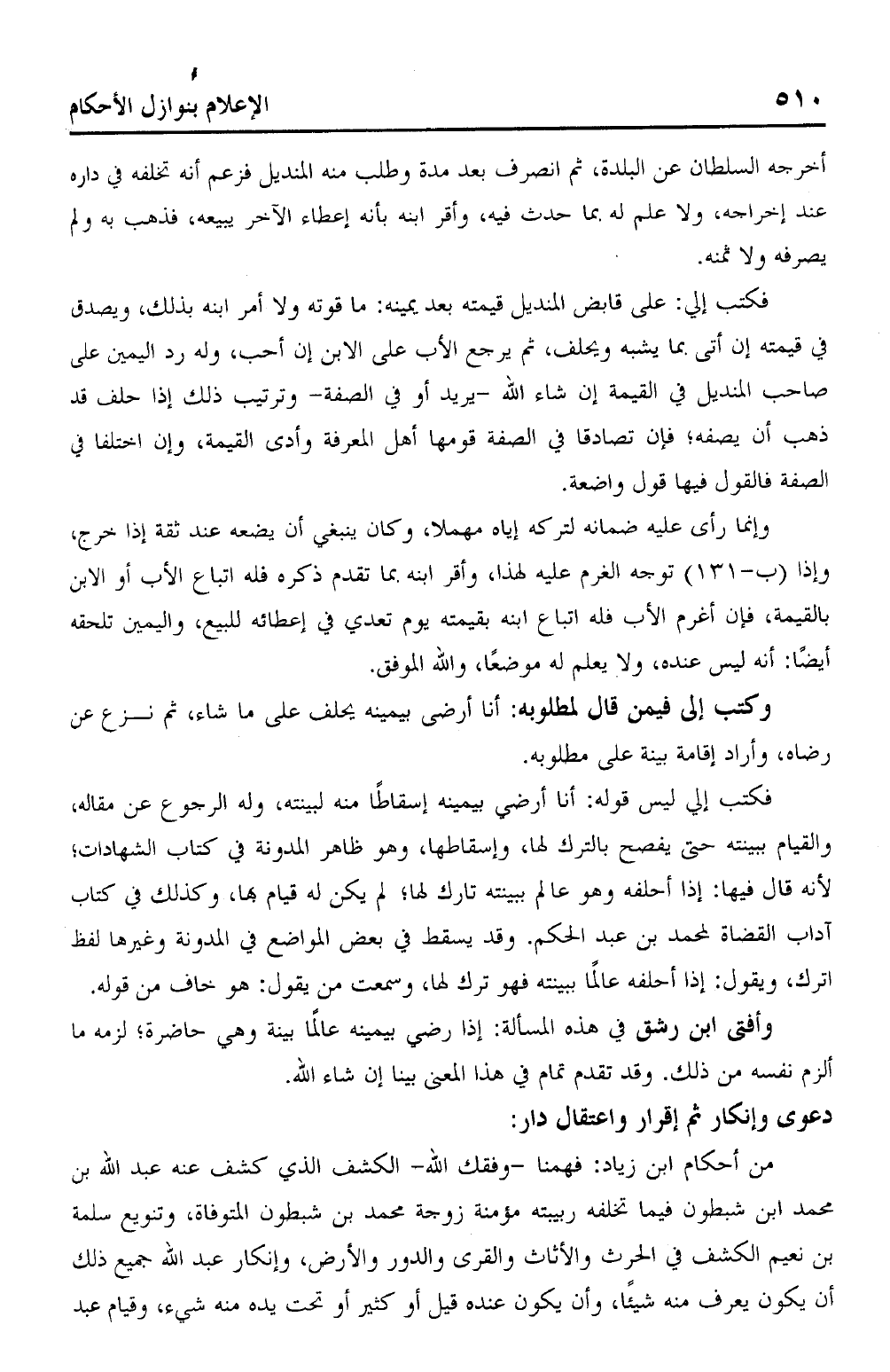 من أحكام ابن زياد: فهمنا – وفقك الله – الكشف الذي كشف عنه عبد الله بن محمد ابن شبطون فيما تخلفه ربيبته مؤمنة زوجة محمد بن شبطون المتوفاة، وتنويع سلمة بن نعيم الكشف في الحرث والأثاث والقرى والدور والأرض، وإنكار عبد الله جميع ذلك أن يكون يعرف منه شيئًا، وأن يكون عنده قيل أو كثير أو تحت يده منه شيء، وقيام عبد