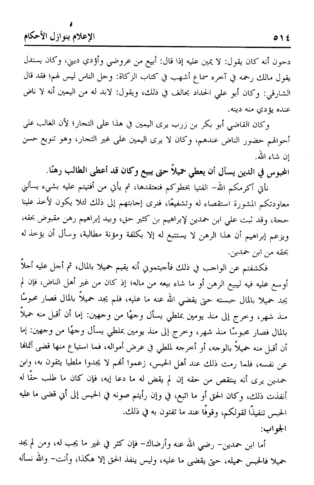نأتي أكرمكم الله – الفتيا بخطوكم فنعتقدها، ثم يأتي من أفتيتم عليه بشيء يسألني معاودتكم المشورة استقصاء له وتشفيعًا، فنرى إجابتهم إلى ذلك لئلا يكون لأخذ علينا حجة، وقد ثبت علي ابن حمدين لإبراهيم بن كثير حق، وبيد إبراهيم رهن مقبوض بحقه، ويزعم إبراهيم أن هذا الرهن لا يستتبع له إلا بكلفة ومؤنة مطالبة، وسأل أن يؤخذ له بحقه من ابن حمدين.