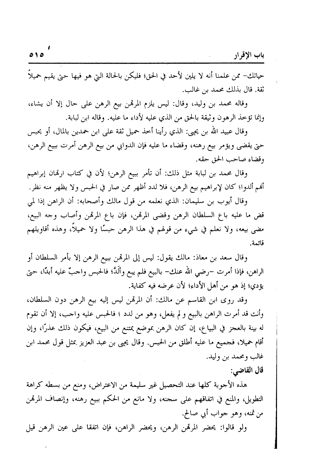 وقال سعد بن معاذ: مالك يقول: ليس إلى المرتهن ببيع الرهن إلا بأمر السلطان أو الراهن، فإذا أمرت – رضي الله عنك – بالبيع فلم يبيع وألَلدَّ؛ فالحبس واجب عليه أبدًا، حتى يؤدي؛ إذ هو من أهل الأداء؛ لأن عرضه فيه كفاية.
