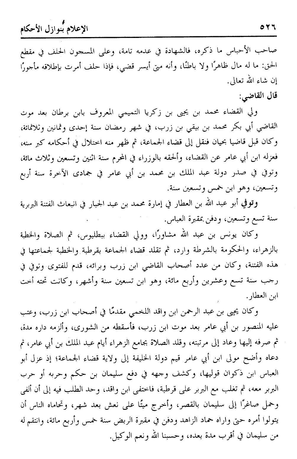وكان يحيى بن عبد الرحمن ابن واقد اللخمي مقدمًا في أصحاب ابن زرب، وعبت عليه المنصور بن أبي عامر بعد موت ابن زرب، فأسقطه من الشورى، وألزمه داره مدة، ثم صرفه إليها وعاد إلى مرتبته، وقلد الصلاة بجامع الزهراء أيام عبد الملك بن أبي عامر، ثم دعاه وأضح مولى ابن أبي عامر قيم دولة الخليفة إلى ولاية قضاء الجماعة؛ إذ عزل أبو العباس ابن ذكوان قوليها، وكشف وجهه في دفع سليمان بن حكم وحربه أو حرب البربر معه، ثم تغلب معه البربر على قرطبة، فاختفى ابن واقد، وحد الطلب فيه إلى أن ألفى وحمل صاغرًا إلى سليمان بالقصر، وأخرج ميتًا على نعش بعد شهر، وتحاماه الناس أن يتولوا أمره حتى واراه حماد الزاهد ودفن في مقبرة الربض سنة خمس وأربع مائة، وانتقم له من سليمان في أقرب مدة بعده، وحسبنا الله ونعم الوكيل.