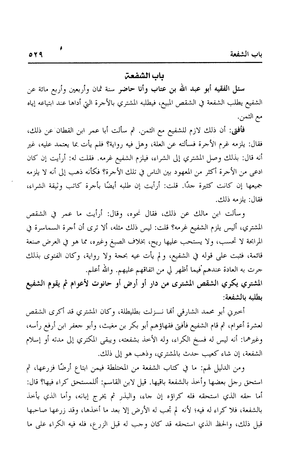 فأفتى: أن ذلك لازم للشفيع مع الثمن. ثم سألت أبا عمر ابن القطان عن ذلك، فقال: يلزمه غرم الأجرة فسألته عن العلة، وهل فيه رواية؟ فلم يأتي بما يعتمد عليه، غير أنه قال: بذلك وصل المشتري إلى الشراء، فيلزم الشفيع غرمه. فقلت له: أرأيت إن كان ادعى من الأجرة أكثر من المعهود بين الناس في تلك الأجرة؟ فكأنه ذهب إلى أنه لا يلزمه جميعها إن كانت كثيرة جدًا. قلت: أرأيت إن طلبه أيضًا بأجرة كاتب وثيقة الشراء، فقال: يلزمه ذلك.