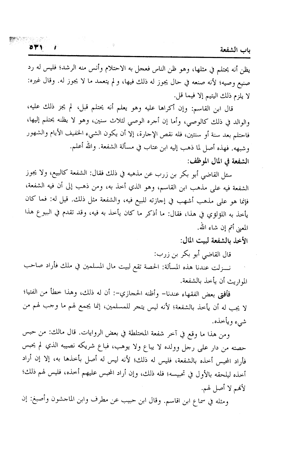 ومن هذا ما وقع في آخر شفعة المختلطة في بعض الروايات. قال مالك: من حبس حصته من دار على رجل وولده لا يباع ولا يوهب، فباع شريكه نصيبه الذي لم يحبس فأراد المحبس أخذه بالشفعة، فليس له ذلك؛ لأنه ليس له أصل بأخذها به، إلا إن أراد أخذه ليلحقه بالأول في تحبيسه؛ فله ذلك، وإن أراد المحبس عليهم أخذهن فليس لهم ذلك؛ لأنهم لا أصل لهم.