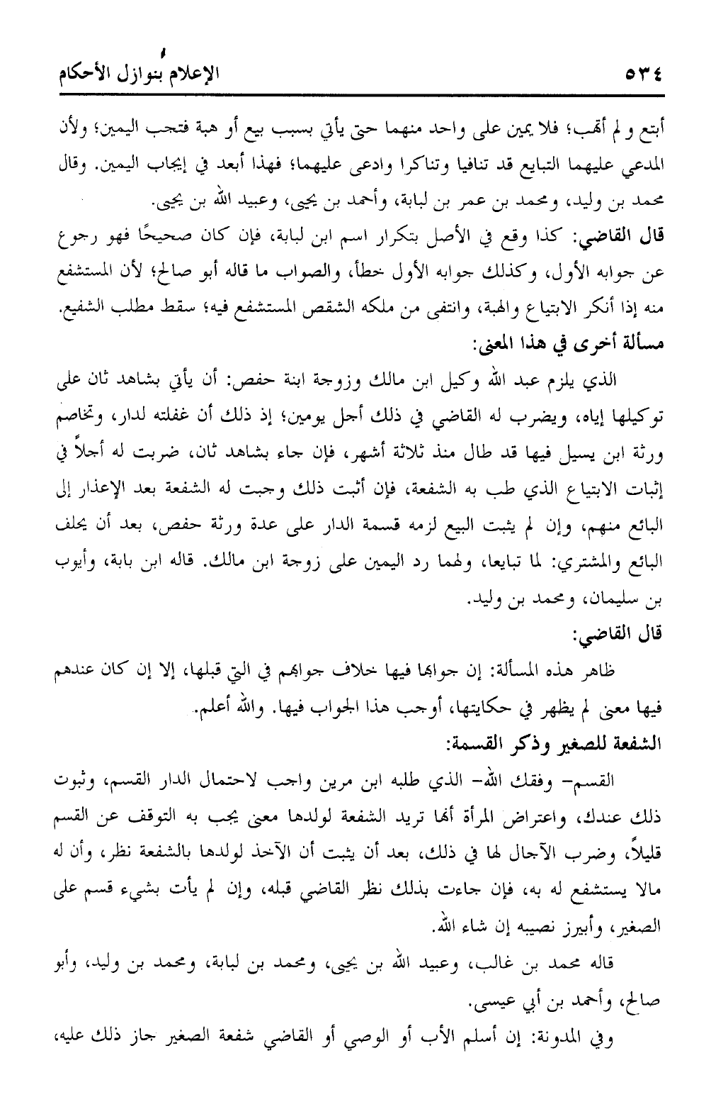 الذي يلزم عبد الله وكيل ابن مالك وزوجة ابنة حفص: أن يأتي بشاهد ثان على توكيلها إياه، ويضرب له القاضي في ذلك أجل يومين؛ إذ ذلك أن غفلته لدار، وتخاصم ورثة ابن يسيل فيها قد طال منذ ثلاثة أشهر، فإن جاء بشاهد ثان، ضربت له أجلاً في إثبات الابتياع الذي طلب به الشفعة، فإن أثبت ذلك وجبت له الشفعة بعد الإعذار إلى البائع منهم، وإن لم يثبت البيع لزمه قسمة الدار على عدة ورثة حفص، بعد أن يحلف البائع والمشتري: لما تبايعا، ولهما رد اليمين على زوجة ابن مالك. قاله ابن بابة، وأيوب بن سليمان، ومحمد بن وليد.