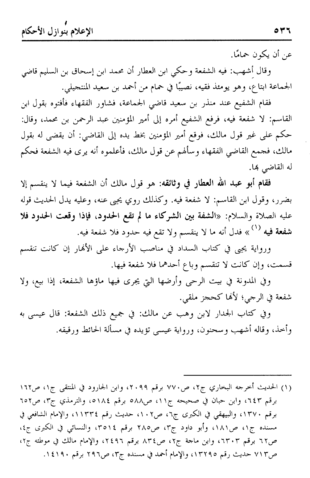 فقام أبو عبد الله العطار في وثائقه: هو قول مالك أن الشفعة فيما لا ينقسم إلا بضرر، وقول ابن القاسم: لا شفعة فيه. وكذلك روي يحيى عنه، وعليه يدل الحديث قوله عليه الاصلة والسلام: "الشفعة بين الشركاء ما لم تقع الحدود، فإذا وقعت الحدود فلا شفعة فيه (¬1) " فدل أنه ما لا ينقسم ولا تقع فيه حدود فلا شفعة فيه.