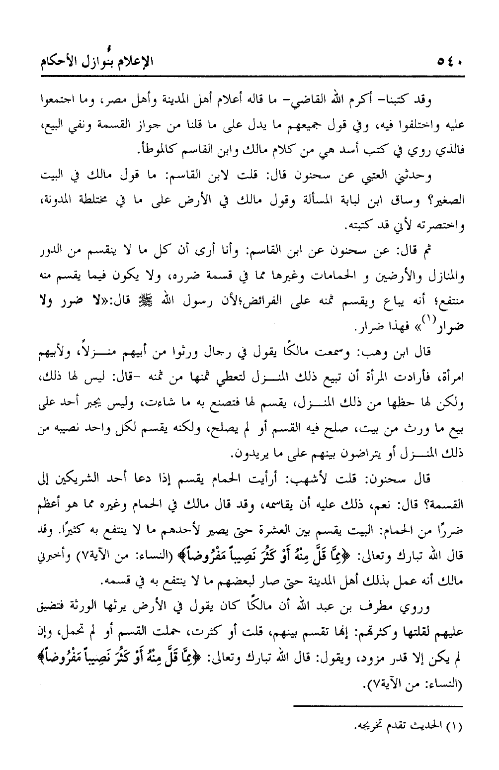 وقد كتبنا – أكرم الله القاضي – ما قاله أعلام أهل المدينة وأهل مصر، وما اجتمعوا عليه واختلفوا فيه، وفي قول جميعهم ما يدل على ما قلنا من جواز القسمة ونفي البيع، فالذي روي في كتب أسد هي من كلام مالك وابن القاسم كالموطأ.