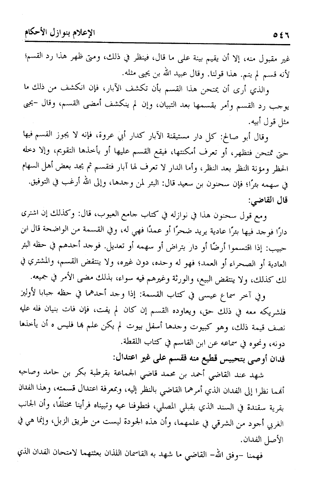 شهد عند القاضي أحمد بن محمد قاضي الجماعة بقرطبة بكر بن حامد وصاحبه أنهما نظرا إلى الفدان الذي أمرهما القاضي بالنظر إليه، وبمعرفة اعتدال قسمته، وهذا الفدان بقرية سقندة في السند الذي بقبلي المصلي، فتطوفنا عيه وتبيناه فرأينا مختلفًا، وأن الجانب الغربي أجود من الشرقي في علمهما، وأن هذه الجودة ليست من طريق الزبل، وإنما هي في الأصل الفدان.