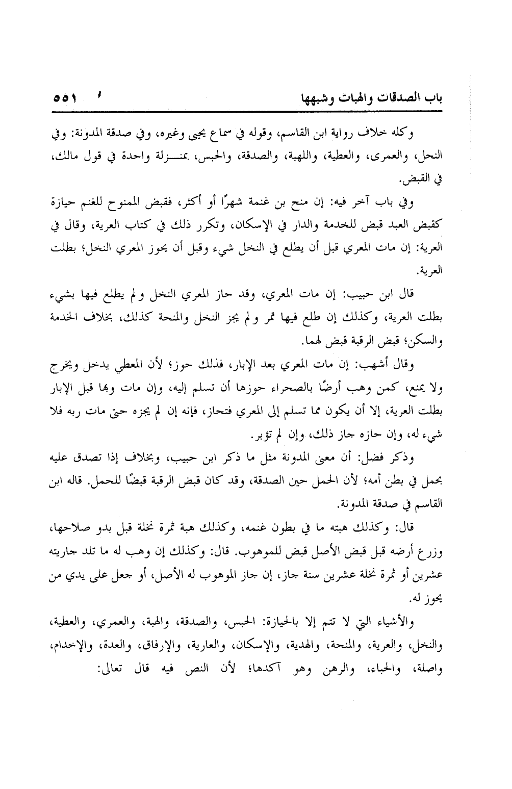 وفي باب آخر فيه: إن منح بن غنمة شهرًا أو أكثر، فقبض الممنوح للغنم حيازة كقبض العبد قبض للخدمة والدار في الإسكان، وتكرر ذلك في كتاب العربة، وقال في العرية: إن مات المعري قبل أن يطلع في النخل شيء وقبل أن يحوز المعري النخل؛ بطلت العربة.