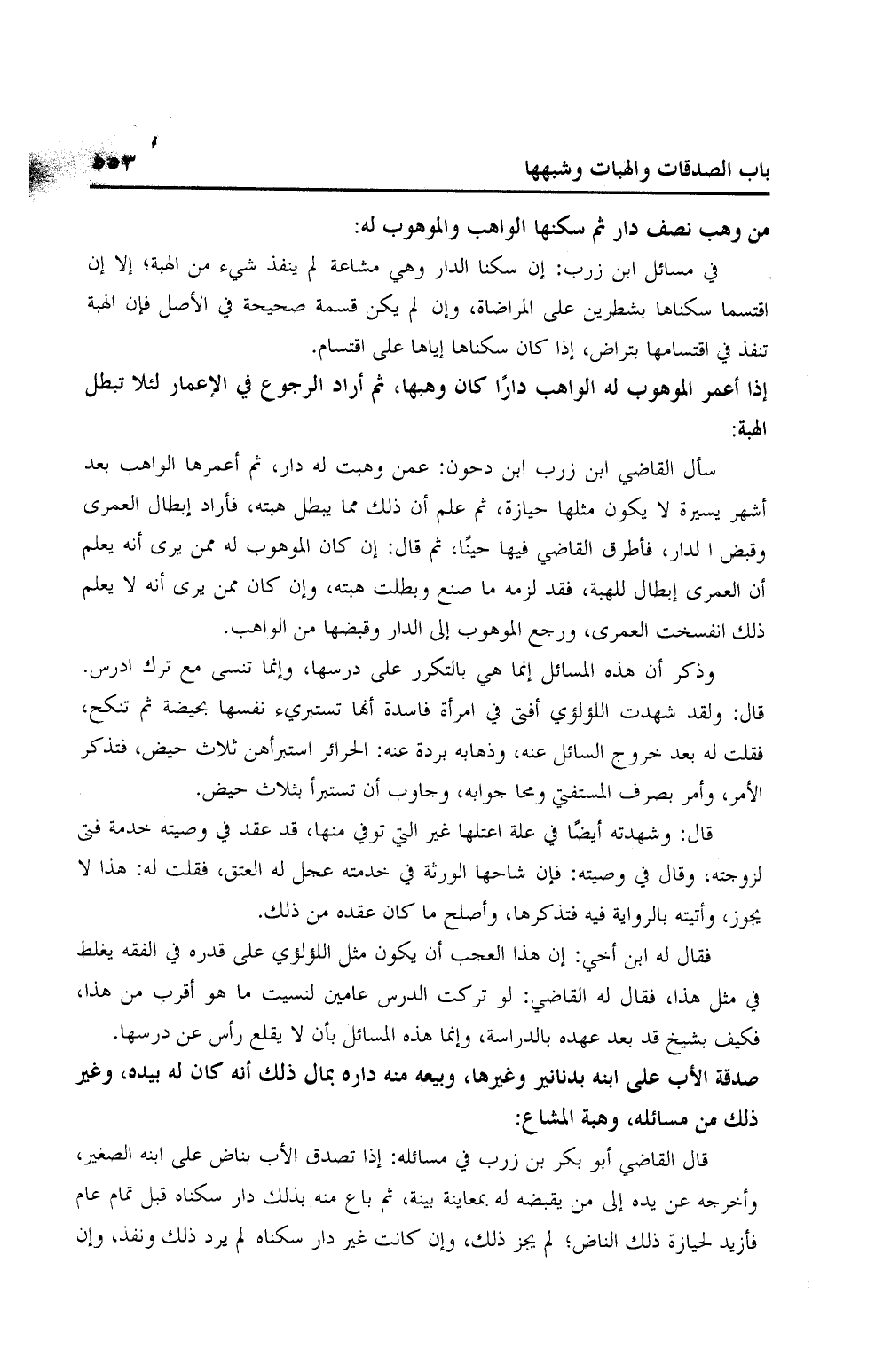 سأل القاضي ابن زرب ابن دحون: عمن وهبت له دار، ثم أعمرها الواهب بعد اشهر يسيرة لا يكون مثلها حيازة، ثم علم أن ذلك مما يبطل هبته، فأراد إبطال العمرى وقبض الدار، فأطرق القاضي فيها حينًا، ثم قال: إن كان الموهوب له ممن يرى أنه يعلم أن العمرى إبطال للهبة، فقد لزمه ما صنع وبطلت هبته، وإن كان ممن يرى أنه لا يعلم ذلك انفسخت العمرى، ورجع الموهوب إلى الدار وقبضها من الواهب.