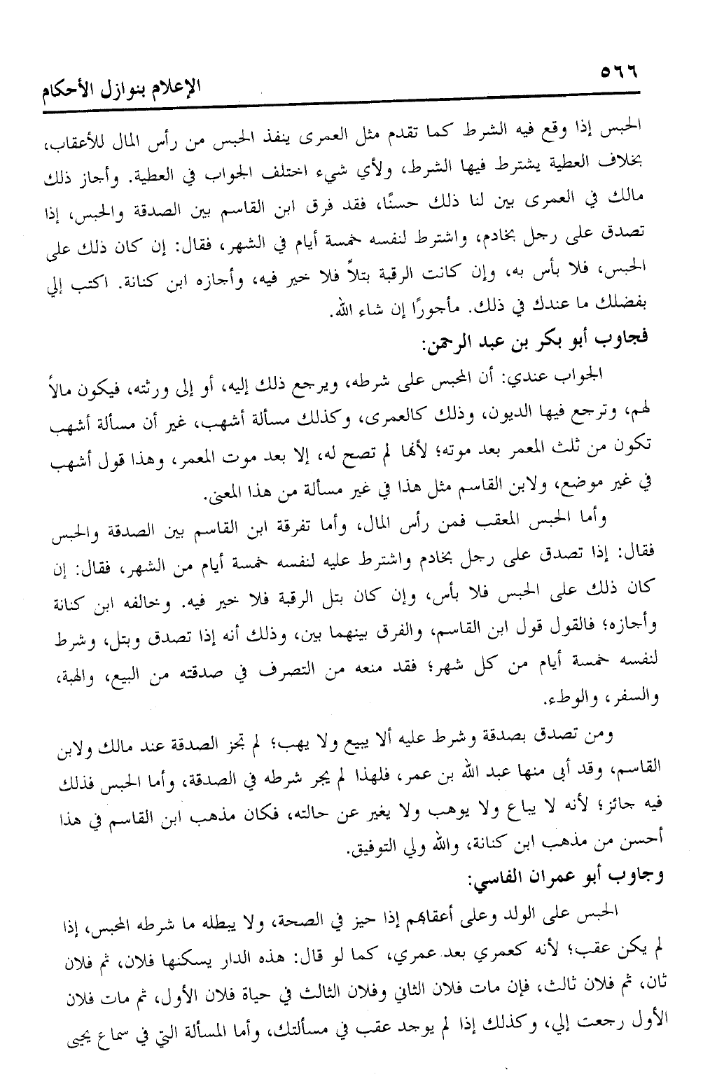 الحبس إذا وقع فيه الشرط كما تقدم مثل العمرى ينفذ الحبس من رأس المال للأعقاب، بخلاف العطية يشترط فيها الشرط، ولأي شيء اختلف الجواب في العطية. وأجاز ذلك مالك في العمرى بين لنا ذلك حسنًا، فقد فرق ابن القاسم بين الصدقة والحبس، إذا تصدق على رجل بخادم، واشترط لنفسه خمسة أيام في الشهر، فقال: إن كان ذلك على الحبس، فلا بأس به، وإن كانت الرقبة بتلاً فلا خير فيه، وأجازه ابن كنانة. اكتب إلي بفضلك ما عندك في ذلك. مأجورًا إن شاء الله.