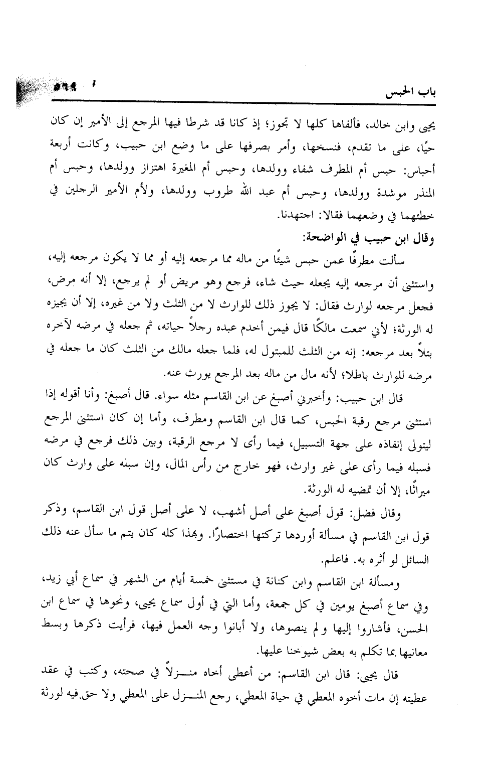 يحيى وابن خالد، فألفاها كلها لا تجوز؛ إذ كانا قد شرطا فيها المرجع إلى الأمير إن كان حيًا، على ما تقدم، فنسخها، وأمر بصرفها على ما وضع ابن حبيب، وكانت أربعة أحباس: حبس أم المطرف شفاء وولدها، وحبس أم المغيرة اهتزاز وولدها، وحبس أم المنذر موشدة وولدها، وحبس أم عبد الله طروب وولدها، ولأم الأمير الرجلين في خطئهما في وضعهما فقالا: اجتهدنا.