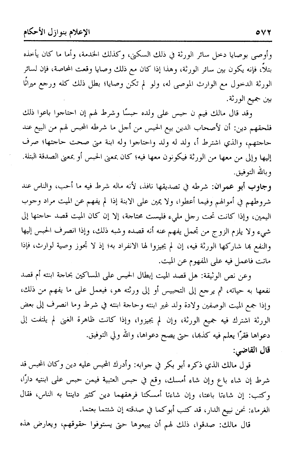 وعن نص الوثيقة: هل قصد الميت إبطال الحبس على المساكين بحاجة ابنته أم قصد نفعها به حياته، ثم يرجع إلى التحبيس أو إلى ورثته هو، فيعمل على ما يفهم من ذلك، وإذا جمع الميت الوصفين ولادة ولد غير ابنته وحاجة ابنته في شرط وما انصرف إلى بعض الورثة اشترك فيه جميع الورثة، وإن لم يجيزوا، وإذا كانت ظاهرة الغنى لم يلتفت إلى دعواها فقرًا يعلم فيه كذبها، حتى يصح دعواها، والله ولي التوفيق.