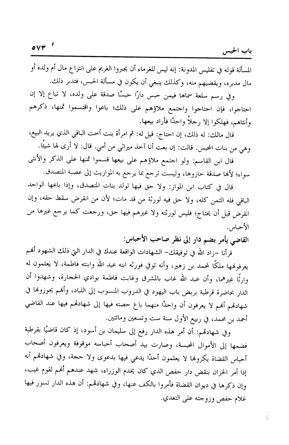 وفي شهادتهم: أن أمر هذه الدار رفع إلى سليمان بن أسود، إذ كان قاضيًا بقرطبة فضمها إلى الأموال المحبسة، وصارت بيد أصحاب أحباسه موقوفة ويعرفون أصحاب أحباس القضاة يكرونها لا يعلمون أحدًا يدعى فيها بدعوى ولا حجة، وفي شهادتهم أنه إذا أمر الخزان بنقض دار حفص الذي كان يخدم الوزراء، شهد عندهم أنهم لقوم غيب، وإن ذكرها في ديوان القضاة فأمروا بالكف عنها، وفي شهادتهم: أن هذه الدار تسور فيها غلام حفص وزوجته على التعدي.