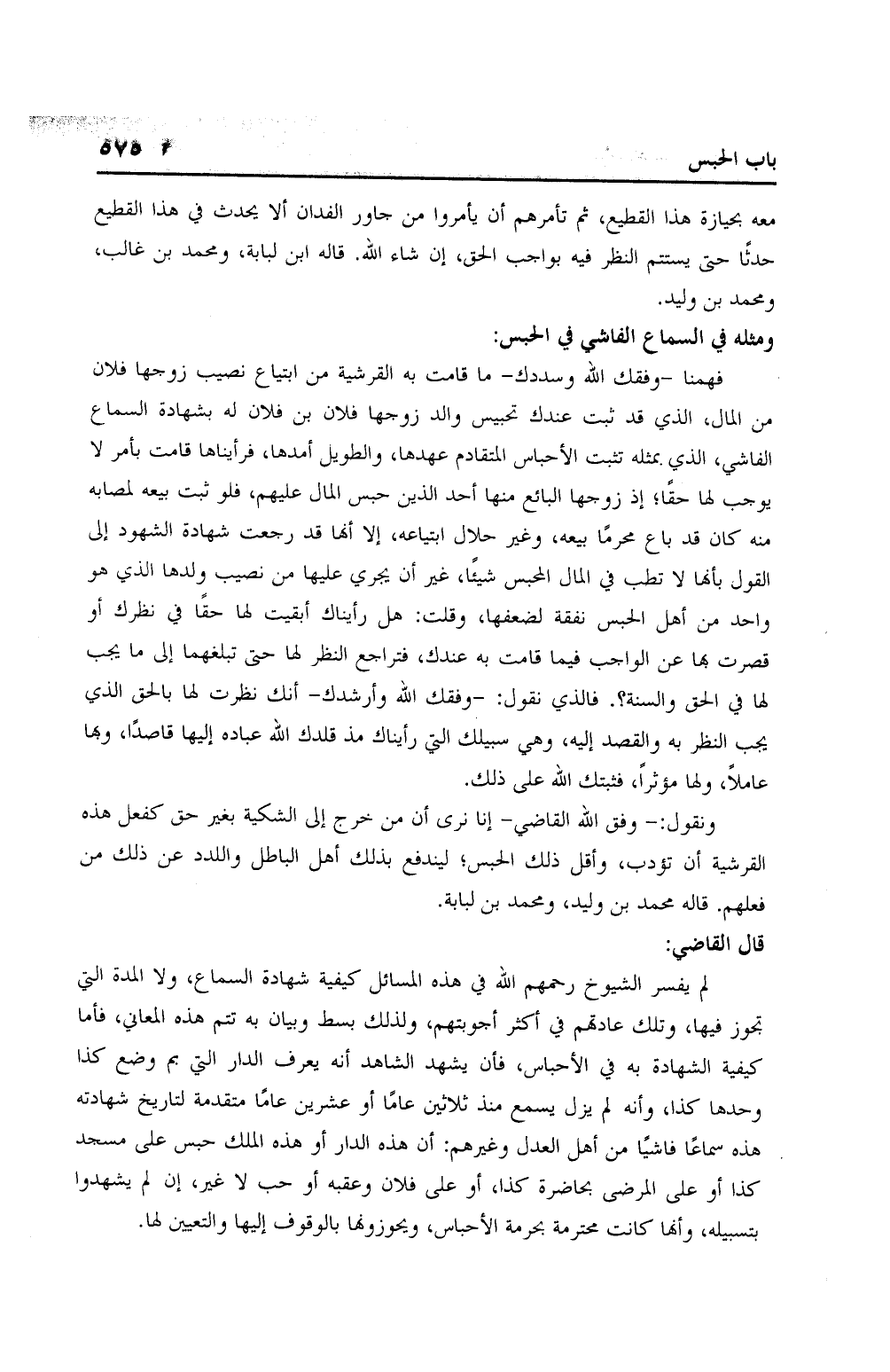 فهمنا – وفقك الله وسددك – ما قامت هب القرشية من ابتياع نصيب زوجها فلان من المال، الذي قد ثبت عندك تحبيس والد زوجها فلان بن فلان له بشهادة السماع الفاشي، الذي بمثله تثبت الأحباس المتقادم عهدها، والطويل أمدها، فرأيناها قامت بأمر لا يوجب لها حقًا؛ إذ زوجها البائع منها أحد الذين حبس المال عليهم، فلو ثبت بيعه لمصابه منه كان قد باع محرمًا بيعه، وغير حلال ابتياعه، إلا أنها قد رجعت شهادة الشهود إلى القول بأنها لا تطلب في المال المحبس شيئًا، غر أن يجري عليها من نصيب ولدها الذي هو واحد من أهل الحبس نفقة لضعفها، وقلت: هل رأيناك أبقيت لها حقًا في نظرن أو قصرت بها عن الواجب فيما قامت به عندك، فتراجع النظر لها حتى تبلغهما إلى ما يجب لها في الحق والسنة؟. فالذي نقول: - وفقك الله وأرشدك – أنك نظرت لها بالحق الذي يجب النظر به والقصد إليه، وهي سبيلك التي رأيناك منذ قلدك الله عباده إليها قاصدًا، وبها عاملاً ولها مؤثرً، فثبتك الله على ذلك.