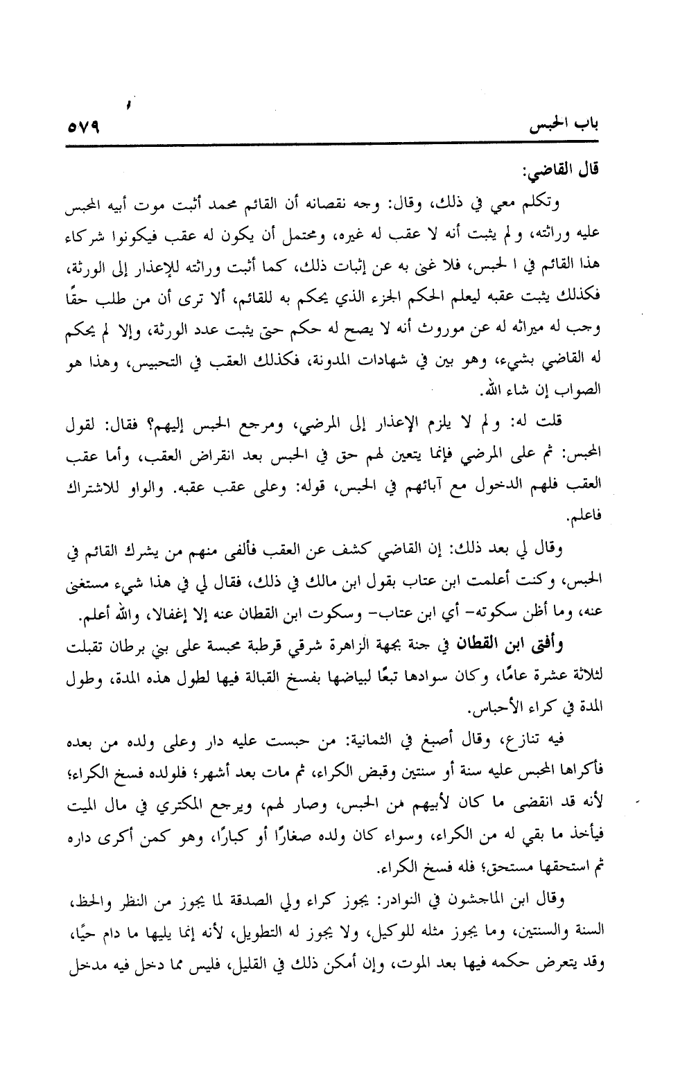 وقال لي بعد ذلك: إن القاضي كشف عن العقب فألفى منهم من يشرك القائم في الحبس، وكنت أعلمت ابن عتاب بقول ابن مالك في ذلك، فقال لي في هذا شيء مستغني عنه، وما أظن سكوته - أي ابن عتاب - وسكوت ابن القطان عنه إلا إغفالا، والله أعلم.