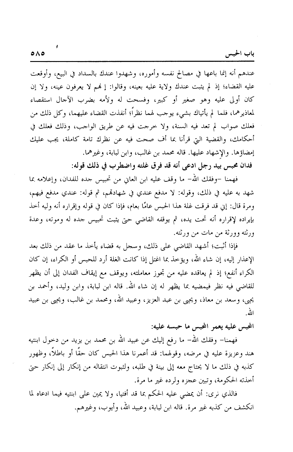 فهمنا - وفقك الله - ما رفع إليك عن عبيد الله بن محمد بن يزيد من دخول ابنتيه هند وعزيزة عليه في مرضه، وقولهما: قد أعمرنا هذا الحبس كان حقًا أو باطلاً، وظهور كذبه في ذلك ما لا يحتاج معه إلى بينة في طلبه، ولثبوت انتقاله من إنكار إلى إنكار حتى أخذته الحكومة، وتبين عجزه ولرده غير ما مرة.