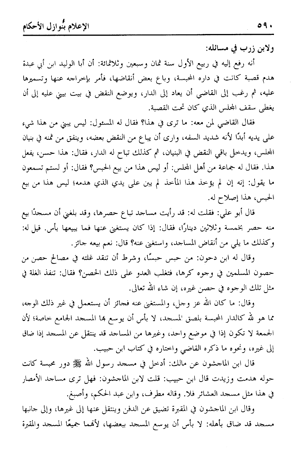فقال القاضي لمن معه: ما ترى في هذا؟ فقال له المسئول: ليس يبني من هذا شيء على يديه أبدًا لأنه شديد السفه، وارى أن يباع من النقض بعضه، وينفق من ثمنه في بنيان المجلس، ويدخل باقي النقض في البنيان، ثم كذلك تباح له الدار، فقال: هذا حسن، يفعل هذا. فقال له جماعة من أهل المجلس: أو ليس هذا من بيع الحبس؟ فقال: أو لستم تسمعون ما يقول: إنه إن لم يؤخذ هذا المأخذ لم يبن على يدي الذي هدمه؛ ليس هذا من بيع الحبس، هذا إصلاح له.