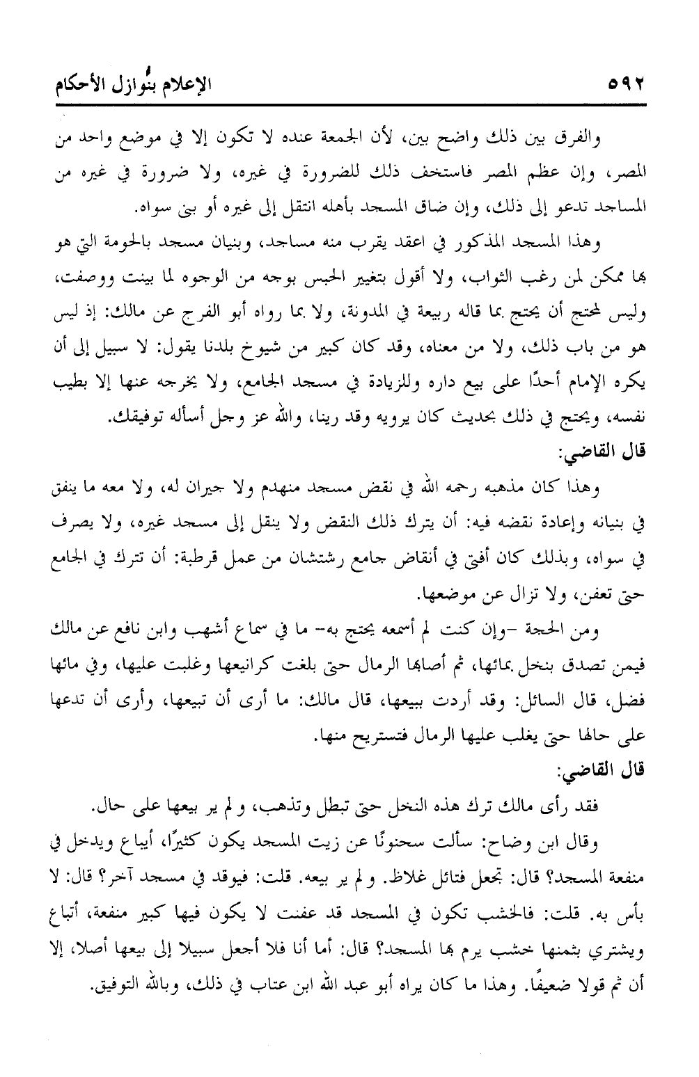 وهذا المسجد المذكور في اعقد يقرب منه مساجد، وبنيان مسجد بالحومة التي هو بها ممكن لمن رغب الثواب، ولا أقول بتغيير الحبس بوجه من الوجوه لما بينت ووصفت، وليس لمحتج أن يحتج بما قاله ربيعة في يالمدونة، ولا بما رواه أبو الفرج عن مالك: إذ ليس هو من باب ذلك، ولا من معناه، وقد كان كبير من شيوخ بلدنا يقول: لا سبيل إلى أن يكره الإمام أحدًا على بيع داره وللزيادة في مسجد الجامع، ولا يخرجه عنها إلا بطيب نفسه، ويحتج في ذلك بحديث كان يرويه وقد رأينا، والله عز وجل أسأله توفيقك.