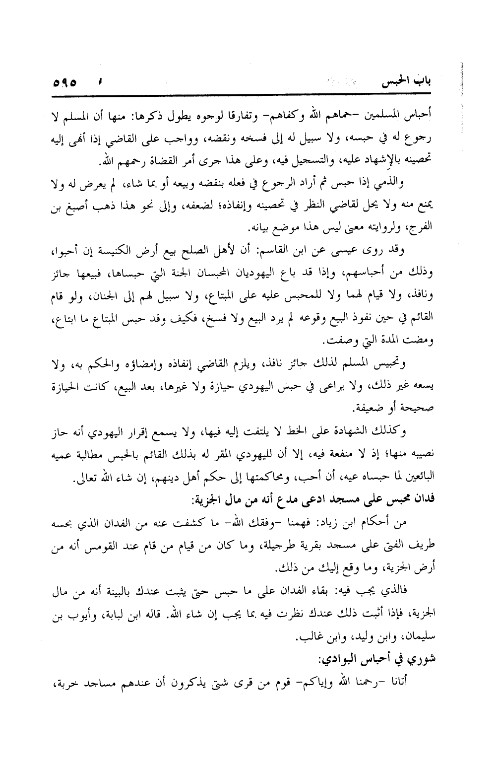 أحباسهم المسلمين – حماهم الله وكفاهم – وتفارقا لوجوه يطول ذكرها: منها أن المسلم لا رجوع له في حبسه، ولا سبيل له إلى فسخه ونقضه، وواجب على القاضي إذا أنهى إليه تحصينه بالإشهاد عليه، والتسجيل فيه، وعلى هذا جرى أمر القضاء رحمهم الله.