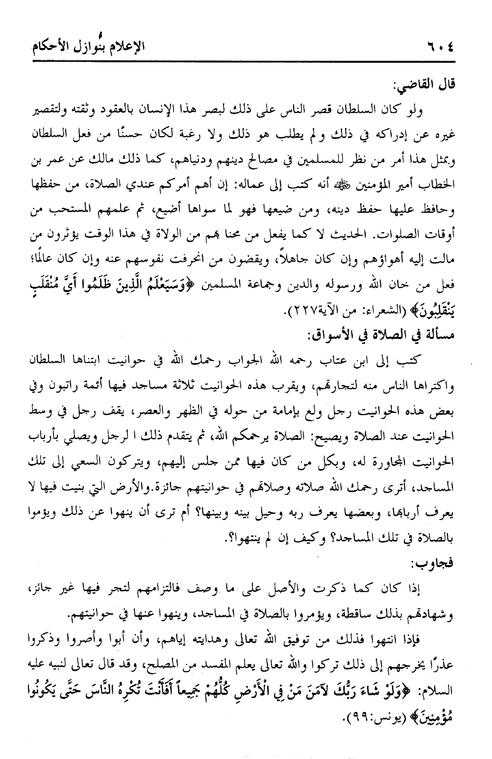 ولو كان السلطان قصر الناس على ذلك ليصر هذا الإنسان بالعقود وثقته ولتقصير غيره عن إدراكه في ذلك ولم يطلب هو ذلك ولا رغبة لكان حسنًا من فعل السلطان ويمثل هذا أمر من نظر المسلمين في مصالح دينهم ودنياهم، كما ذلك مالك عن عمر بن الخطاب أمور المؤمنين (رضي الله عنه) أنه كتب إلى عماله: إن أهم أمركم عندي الصلاة، من حفظها وحافظ عليها حفظ دينه، ومن ضيعها فهو لما سواها أضيع، ثم علمهم المستحب من أوقات الصلوات، الحديث لا كما يفعل من محنا بهم من الولاة في هذا الوقت يؤثرون من مالت اليه أهواؤهم وإن كان جاهلاً، ويقضون من انحرفت نفوسهم عنه وإن كان عالمًا؛ فعل من خان الله ورسوله والدين وجماعة المسلمين (وسَيَعْلَمُ الَّذِينَ ظَلَمُوا أَيَّ مُنقَلَبٍ يَنقَلِبُونَ) (الشعراء من الآية 227)