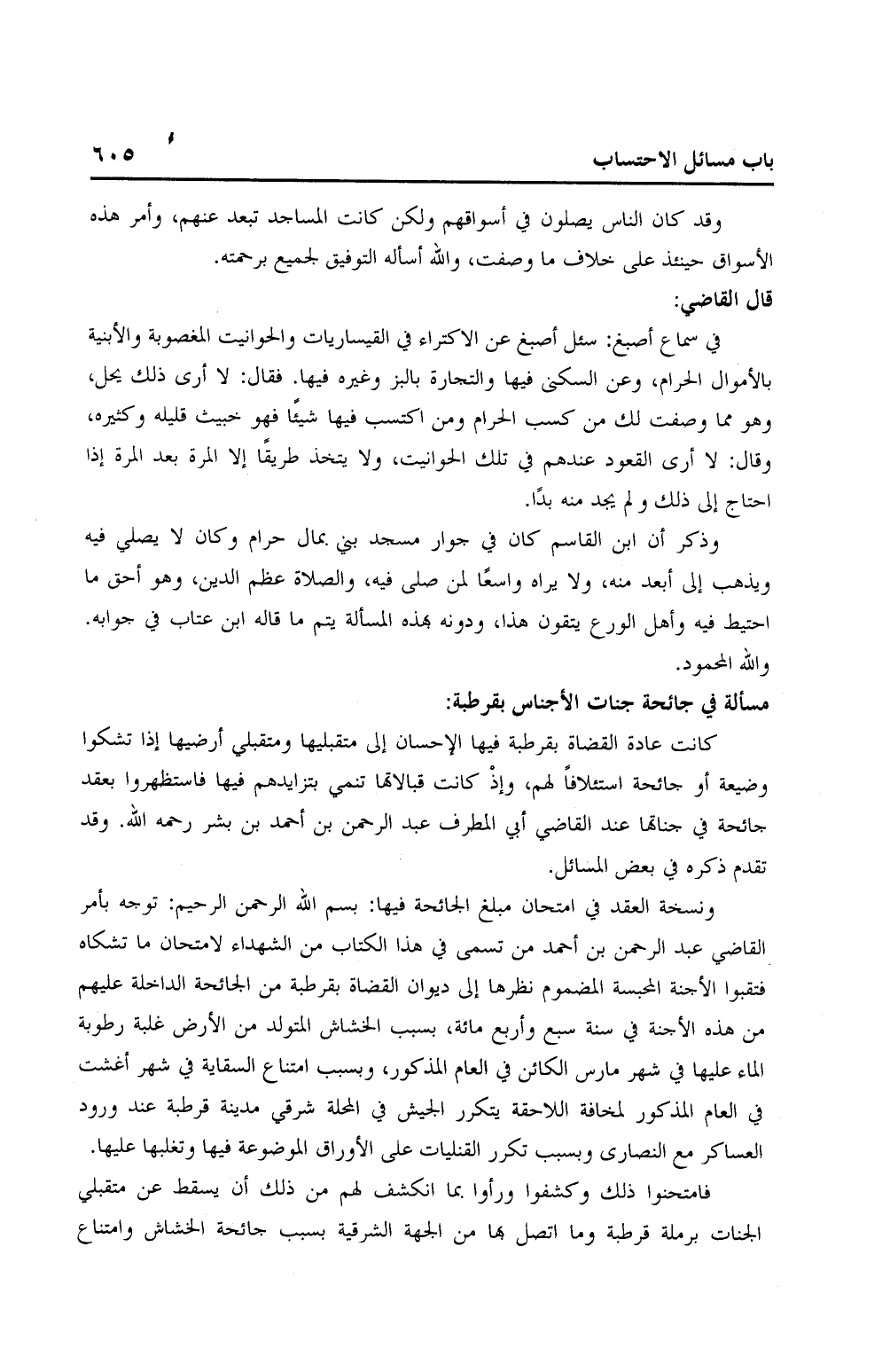 ونسخة العقد في امتحان مبلغ الجائحة فيها: بِسْمِ اللَّهِ الرَّحْمَنِ الرَّحِيمِ: توجه بأمر القاضي عبد الرحمن بن أحمد من تسمى في هذا الكتاب من الشهداء لامتحان ما تشكاه فتقيوا الأجنة المحبسة المضمون نظرها إلى ديوان القضاء بقرطبة من الجائحة الداخلة عليهم من هذه الأجنة في سنة سبع وأربع مائة، بسبب الخشاش المتولد من الأرض غلبة رطوبة الماء عليها في شهر مارس الكائن في العام المذكور، وبسبب امتناع السقاية في شهر أغشت في العام المذكور لمخافة اللاحقة يتكرر الجيش في المحلة شرقي مدينة قرطبة عند ورود العساكر مع النصارى وبسبب تكرر القبليات على الأوراق الموضوعة فيها وتغلبها عليها.