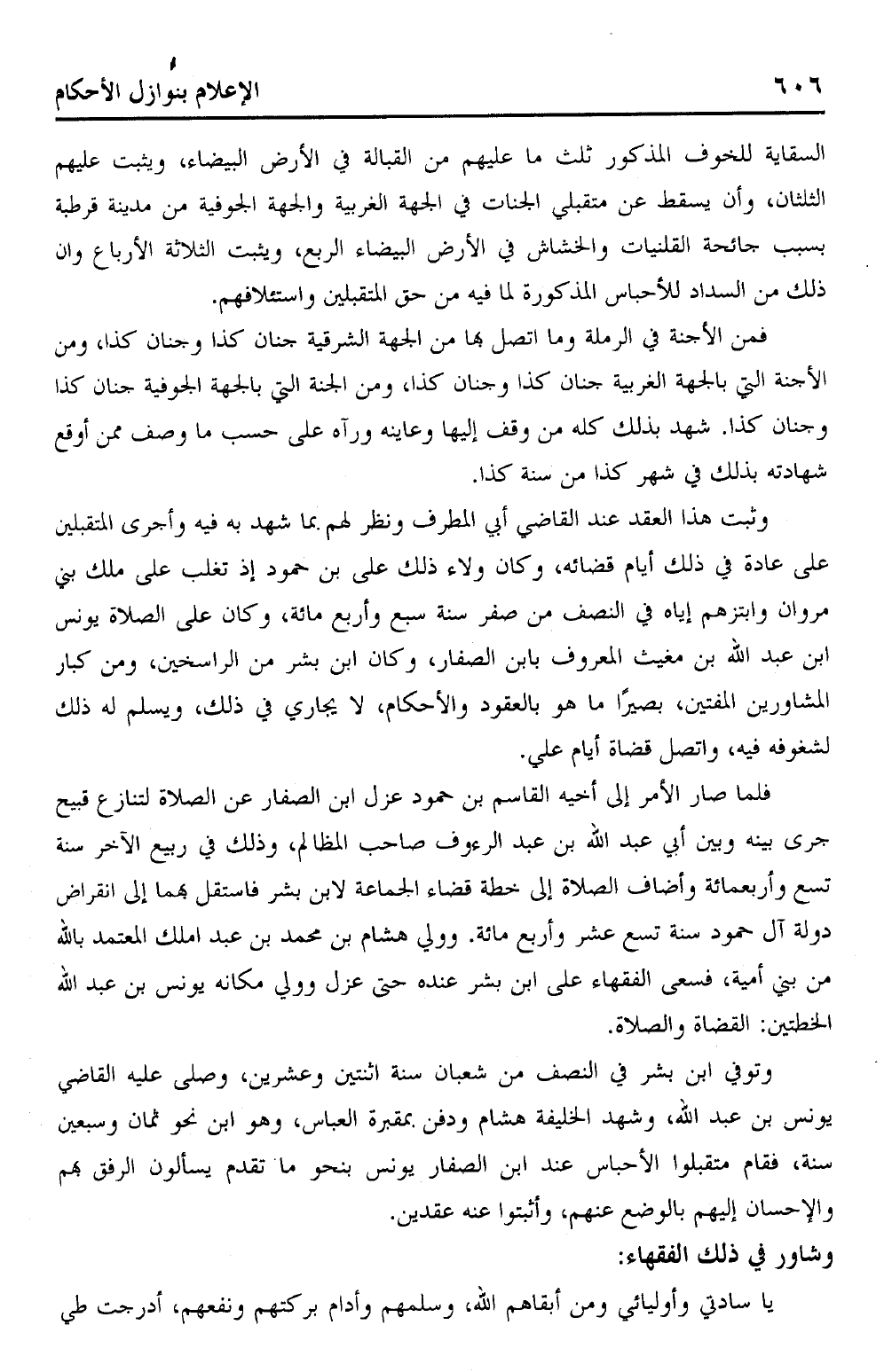 وثبت هذا العقد عند القاضي أبي المطرف ونظر لهم بما شهد به فيه وأجرى المتقبلين على عادة في ذلك أيام قضائه وكان ولاء ذلك على بن حمود اذ تغلب على ملك بني مروان وابتزهم إياه في النصف من صفر سنة سبع وأربع مائة، وكان على الصلاة يونس ابن عبد الله بن مغيث المعروف بابن الصفار، وكان ابن بشر من الراسخين، ومن كبار المشاورين المفتين، بصيرًا ما هو بالعقود والأحكام، لا يجاري في ذلك، ويسلم له ذلك لشغوفه فيه، واتصل قضاة أيام علي.