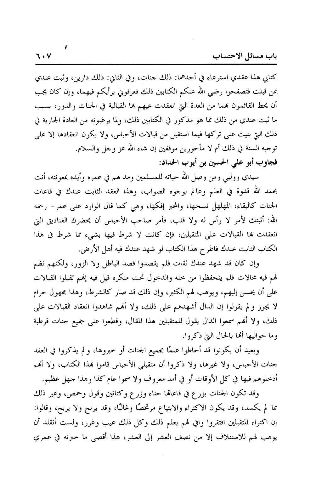 سيدي وولي ومن وصل الله حياته للمسلمين ومدهم في عمره وأيده تعونته، أنت بحمد الله قدوة في العلم وعالم بوجوه الصواب، وهذا العقد الثابت عندك في قاعات الجنات كالبقاء، المهلهل نسجها، والمحبر إفكها، وهي كما قال الوارد على عمر – رحمه الله: أثبتك لأمر لا رأس له ولا قلب، فأمر صاحب الأحباس أن يحضركالفناديق التي انعقدت بها القبلات على المتقبلين، فإن كانت لا شرط فيها بشيء مما شرط في هذا الكتاب الثابت عندك فاطرح هذا الكتاب لو شهد عندك فيه أهل الأرض.