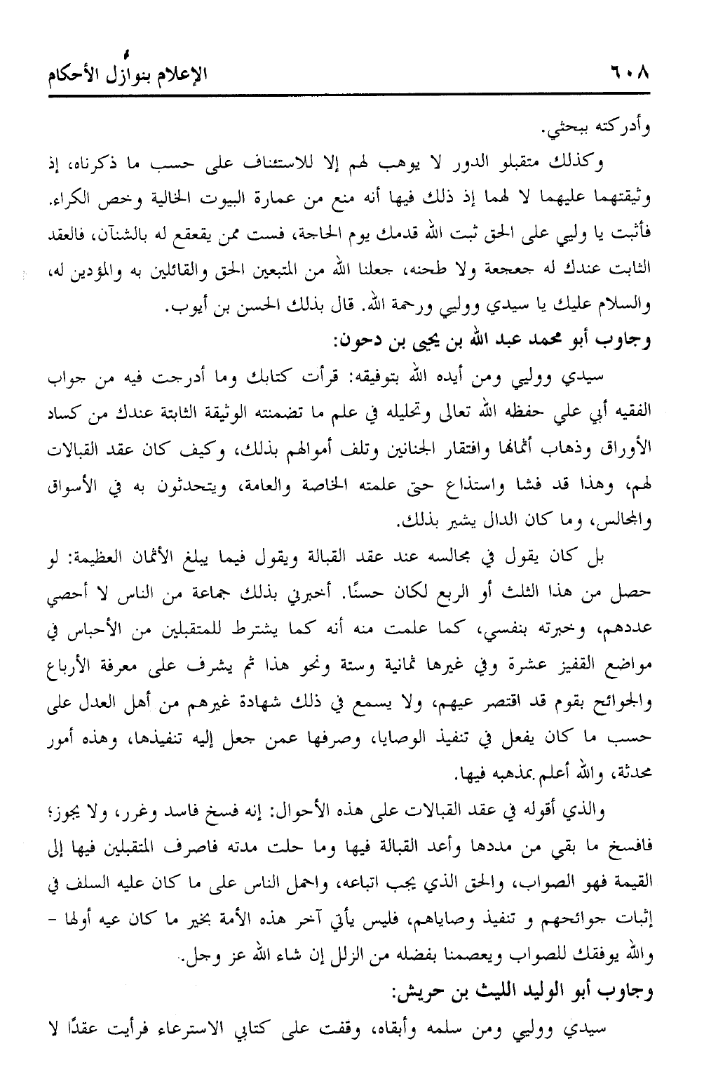 سيدي ووليي ومن ايده الله بتوفيقه: قرأت كتابك وما أدرجت فيه من جواب الفقيه أبي علي حفظه الله تعالى وتحليله في علم ما تضمنته الوثيقة الثابتة عندك من كساد الأوراق وذهاب أثمانها وافتقار الجنانين وتلف أموالهم بذلك، وكيف كان عقد القبالات لهم، وهذا قد فشا واستذاع حتى علمته الخاصة والعامة، ويتحدثون به في الأسواق والمجالس، وما كان الدال يشير بذلك.