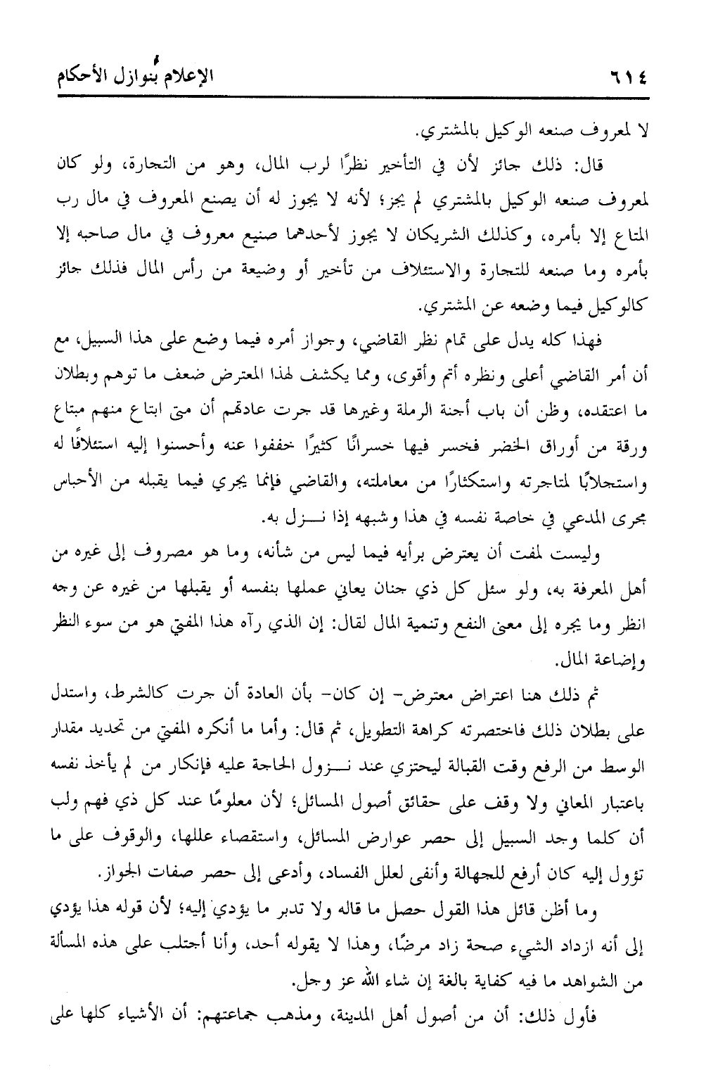 ثم ذلك هنا اعتراض معترض – إن كان – بأن العادة أن جرت كالشرط، واستدل على بطلان ذلك فاختصرته كراهة التطويل، ثم قال: وأما ما أنكره المفتي من تحديد مقدار الوسط من الرفع وقت القبالة ليحتزي عند نزول الحاجة عليه فإنكار من لم يأخذ نفسه باعتبار المعاني ولا وقف على حقائق أصول المسائل؛ لأن معلومًا عند كل ذي فهم ولب أن كلما وجد السبيل إلى حصر عوارض المسائل، واستقصاء عللها، والوقوف على ما تؤول إليه كان أرفع للجهالة وأنفى لعلل الفساد، وأدعى إلى حصر صفات الجواز.