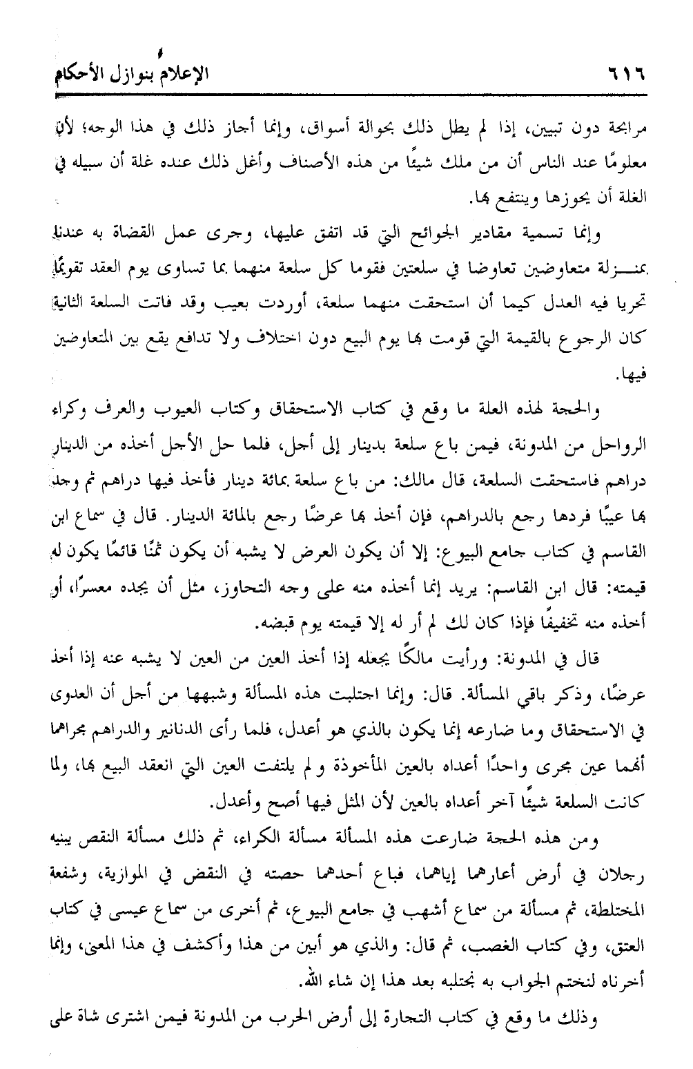 والحجة لهذه العلة ما وقع في كتاب الاستحقاق وكتاب العيوب والعرف وكراء الرواحل من المدونة، فيمن باع سلعة بدينار إلى أجل، فلما حل الجل أخذه من الدينار دراهم فساتحقت السلعة، قال مالك: من باع سلعة بمائة دينار فأخذ فيها دراهم ثم وجد بها عيبًا فردها رجع بالدراهم، فإن أخذ بها عرضًا رجع بالمائة الدينار. قال في سماع ابن القاسم في كتاب جامع البيوع: إلا أن يكون العرض لا يشبه أن يكون ثمنًا قائمًا يكون له قيمته: قال ابن القاسم: يريد إنما أخذه منه على وجه التحاوز، مثل أن يجده معسرًا، أو أخذه منه تخفيفًا فإذا كان لك لم أر له إلا قيمته يوم قبضه.