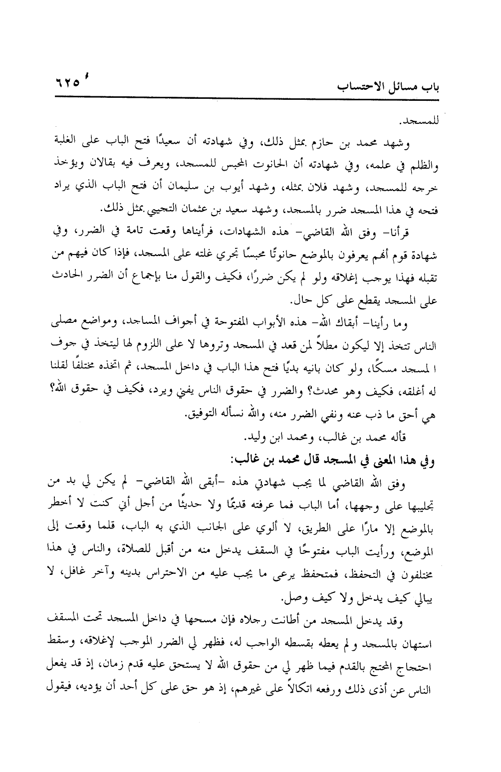 وشهد محمد بن حازم بمثل ذلك، وفي شهادته أن سعيدًا فتح الباب على الغلبة والظلم في علمه، وفي شهادته أن الحانوت المحبس للمسجد، ويعرف فيه بقالان ويؤخذ خرجه للمسجد، وشهد فلان بمثله، وشهد أيوب بن سليمان أن فتح الباب الذي يراد فتحه في هذا المسجد ضرر بالمسجد، وشهد سعيد بن عثمان التجيي بمثل ذلك.