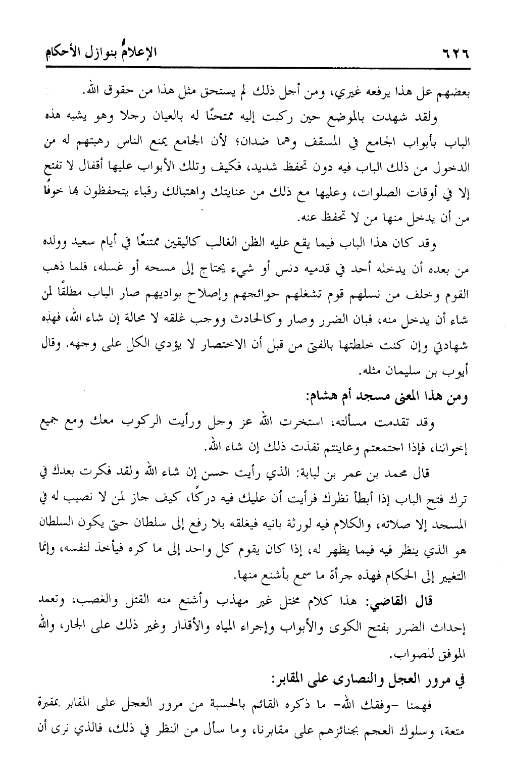 قال محمد بن عمر بن لبابة: الذي رأيت حسن إن شاء الله ولقد فكرت بعدك في ترك فتح الباب إذا أبطأ نظرك فرأيت أن عليك فيه دركًا، كيف جاز لمن لا نصيب له في المسجد إلا صلاته، والكلام فيه لورثة بانيه فيغلقه بلا رفع إلى سلطان حتى يكون السلطان هو الذي ينظر فيه فيما يظهر له، إذا كان يقوم كل واحد إلى ما كره فيأخذ لنفسه، وإنما التغيير إلى الحكام فهذه جرأة ما سمع بأشنع منها.