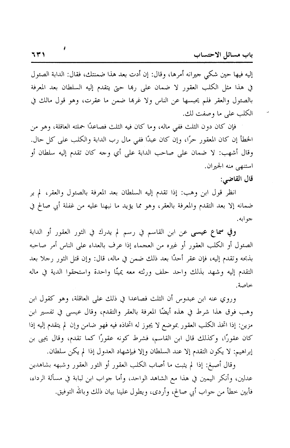 انظر قول ابن وهب: إذا تقدم إليه السلطان بعد المعرفة بالصئول والعقر، لم ير ضمانه إلا بعد التقدم والمعرفة بالعقر، وهو مما يؤيد ما نبهنا عليه من غفلة أبي صالح في جوابه.