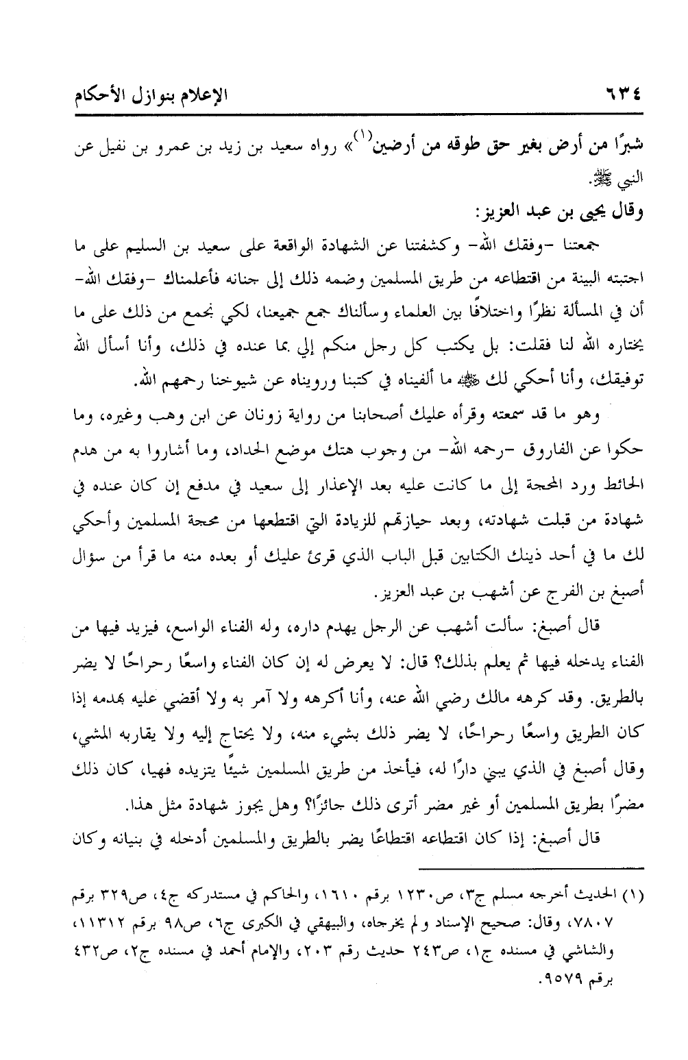 وهو ما قد سمعته وقرأه عليك أصحابنا من رواية زونان عن ابن وهب وغيره، وما حكوا عن الفاروق – رحمه الله – من وجوب هتك موضع الحداد، وما أشاروا به من هدم الحائط ورد المحجة إلى ما كانت عليه بعد الإعذار إلى سعيد في مدفع إن كان عنده في شهادة من قبلت شهادته، وبعد حيازتهم للزيادة التي اقتطعها من محجة المسلمين وأحكي لك ما في أحد ذينك الكتابين قبل الباب الذي قرئ عليك أو بعده منه ما قرأ من سؤال أصبغ بن الفرج عن أشهب بن عبد العزيز.