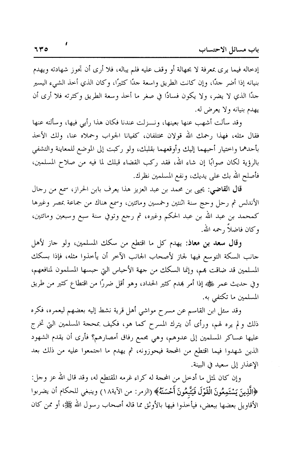 وقال سعد بن معاذ: يهدم كل ما اقتطع من سكك المسلمين، ولو جاز لأهل جانب السكة التوسع فيها لجاز لأصحاب الجانب الآخر أن يأخذوا مثله، فإذا بسكك المسلمين قد ضاقت بهم، وإنما السكك من جهة الأحباس التي حبسها المسلمون لمنافعهم، وفي حديث عمر (رضي الله عنه) إذا أمر بهدم كثير الحداد، وهو أقل ضررًا من اقتطاع كثير من طريق المسلمين ما تكتفي به. وقد سئل ابن القاسم عن مسرح مواشي أهل قرية نشط إليه بعضهم ليعمره، فكره ذلك ولم يره لهم، ورأى أن يترك المسرح كما هو، فكيف بمحجة المسلمين التي تخرج عليها عساكر المسلمين إلى عدوهم، وهي مجمع رفاق أمصارهم؟ فأرى أن يقدم الشهود الذين شهدوا فيما اقتطع من المحجة فيحوزونه، ثم يهدم ما اجتمعوا عليه من ذلك بعد الإعذار إلى سعيد في البينة.