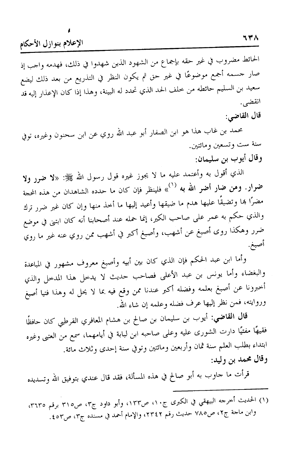الذي أقول به وأعتمد عليه ما لا يجوز غيره قول رسول الله (صلى الله عليه وسلم): "لا ضرر ولا ضرار. ومن ضار أضر الله به (¬1) " فلينظر فإن كان ما حدده الشاهدان من هذه المحجة مضرًا بها وتضيقًا عليها هدم ما ضيقها وأعيد إليها ما أخذ منها وإن كان غر ضرر ترك والذي حكم به عمر على صاحب الكير، إنما حمله عند أصحابنا أنه كان ابتنى في موضع ضرر وهكذا روى أصبغ عن أشهب، وأصبغ أكبر في أشهب ممن روي عنه غير ما روي أصبغ.