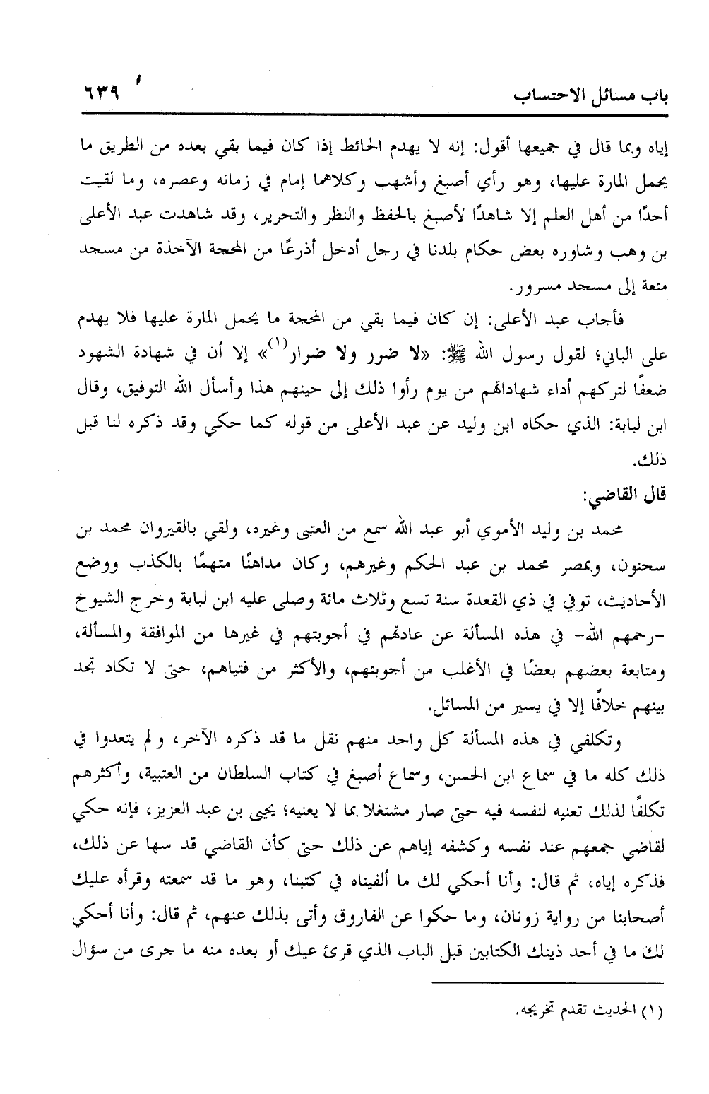 إياه وبما قال في جميعها اقول: إنه لا يهدم الحائط إذا كان فيما بقي بعده من الطريق ما يحمل المارة عليها، وهو رأي أصبغ وأشهب وكلاهما إمام في زمانه وعصره، وما لقيت أحدًا من أهل العلم إلا شاهدًا لأصبغ بالحفظ والنظر والتحرير، وقد شاهدت عبد الأعلى بن وهب وشاوره بعض حكام بلدنا في رجل أدخل أذرعًا من المحجة الآخذة من مسجد متعة إلى مسجد مسرور.