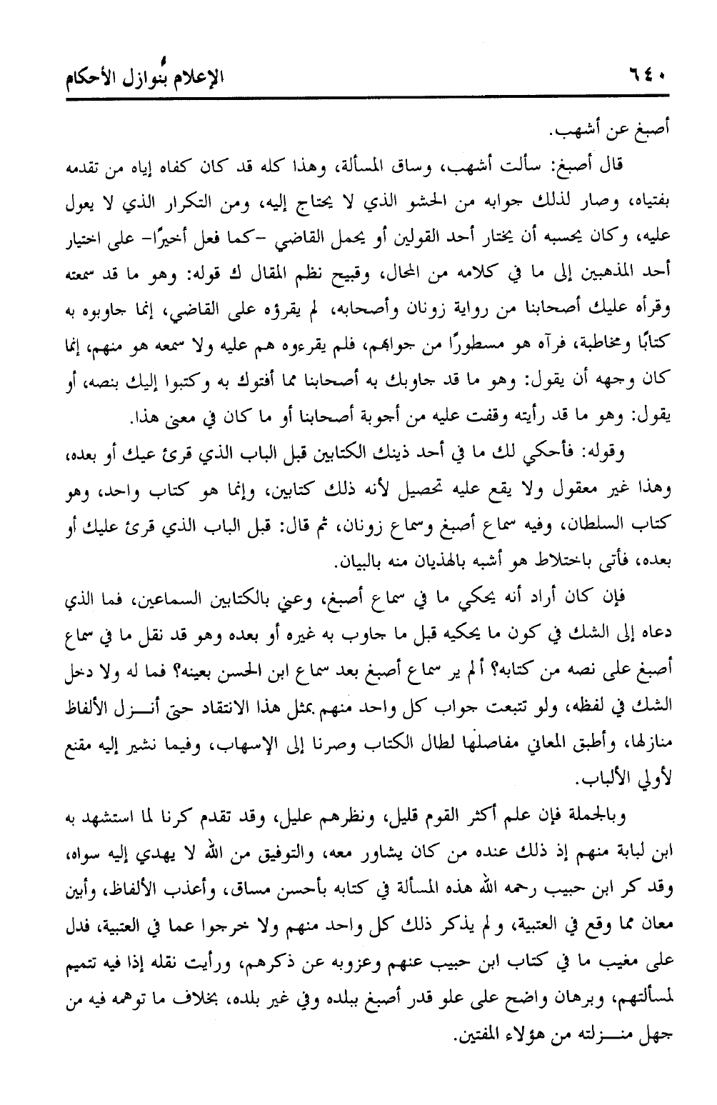 وبالجملة فإن علم أكثر القوم قليل، ونظرهم عليل، وقد تقدم كرنا لما استشهد به ابن لبابة منهم إذ ذلك عنده من كان يشاور معه، والتوفيق من الله لا يهدي إليه سواه، وقد كر ابن حبيب رحمه الله هذه المسألة في كتابه بأحسن مساق، وأعذب الألفاظ، وأبين معان مما وقع في العتبية، ولم يذكر ذلك كل واحد منهم ولا خرجوا عما في العتبية، فدل على مغيب ما في كتاب ابن حبيب عنهم وعزوبه عن ذكرهم، ورأيت نقله إذا فيه تتميم لمسألتهم، وبرهان واضح على علو قدر أصبغ ببلده وفي غير بلده، بخلاف ما توهمه فيه من جهل منزلته من هؤلاء المفتين.