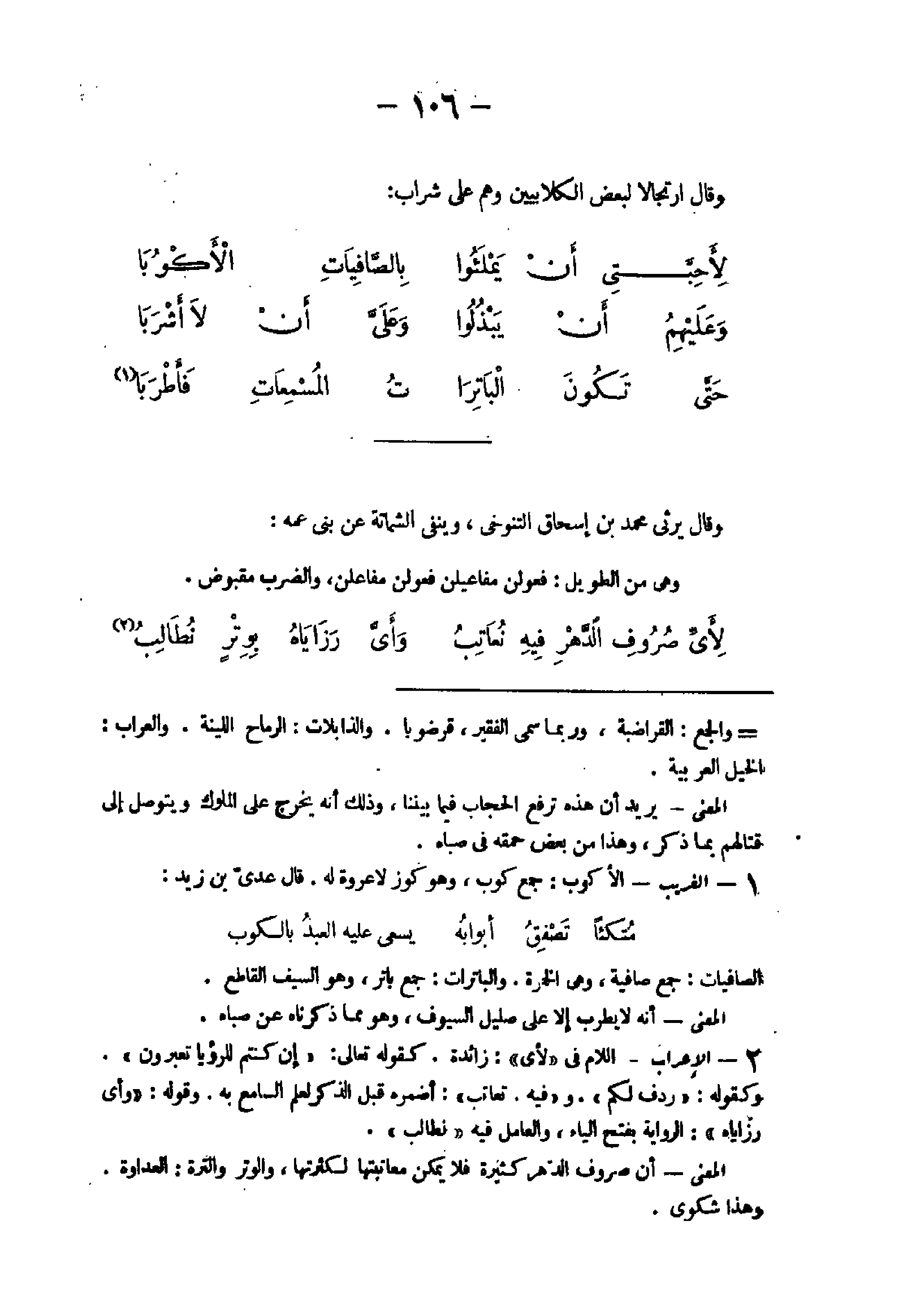 - 1 - الْإِعْرَاب اللَّام فى لأى زَائِدَة كَقَوْلِه تَعَالَى {إِن كُنْتُم للرؤيا تعبرون} وَكَقَوْلِه {ردف لكم} و {وَفِيه تعاتب} أضمره قبل الذّكر لعلم السَّامع بِهِ وَقَوله {وأى رزاياه} الرِّوَايَة بِفَتْح الْيَاء وَالْعَامِل فِيهِ نطالب الْمَعْنى أَن صروف الدَّهْر كَثِيرَة فَلَا يُمكن معاتبتها لكثرتها وَالْوتر والترة الْعَدَاوَة وَهَذَا شكوى