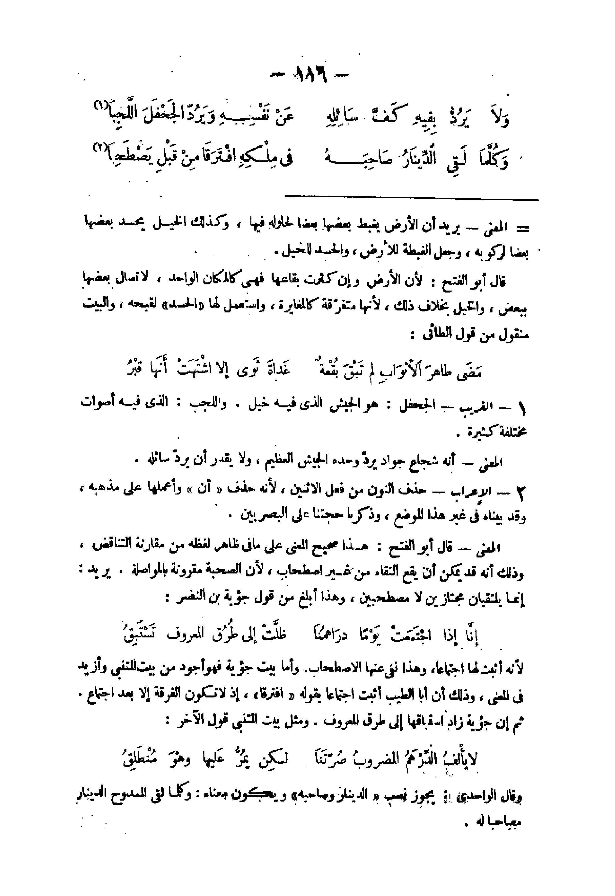 22 - الْإِعْرَاب حذف النُّون من فعل الِاثْنَيْنِ لِأَنَّهُ حذف أَن وأعملها على مذْهبه وَقد بَيناهُ فى غير هَذَا الْموضع وَذكرنَا حجتنا على الْبَصرِيين الْمَعْنى قَالَ أَبُو الْفَتْح هَذَا // صَحِيح الْمَعْنى // على مَا فى ظَاهر لَفظه من مُقَارنَة التَّنَاقُض وَذَلِكَ أَنه قد يُمكن أَن يَقع التقاء من غير اصطحاب لِأَن الصُّحْبَة مقرونة بالمواصلة يُرِيد إِنَّمَا يَلْتَقِيَانِ مجتازين لَا مصطحبين وَهَذَا أبلغ من قَول جؤية بن النَّضر