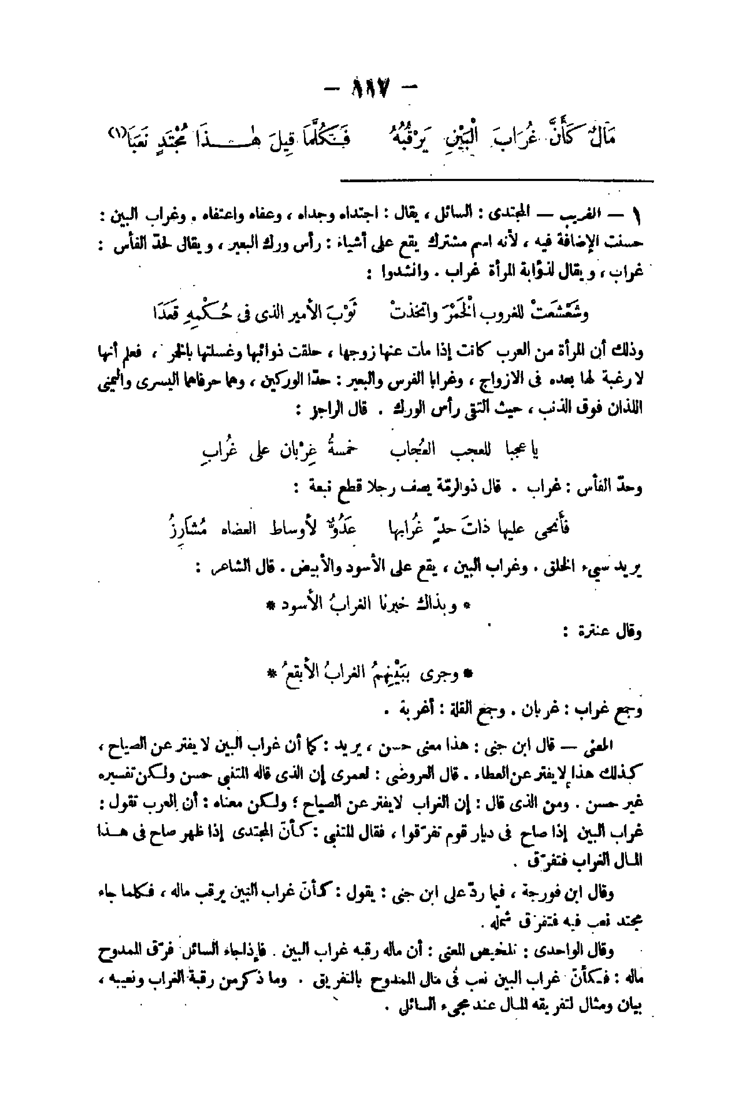 (وَجَرَى ببَيْنِهِم الغُرَابُ الأبْقَعُ وَجمع غراب غربان وَجمع الْقلَّة أغربة الْمَعْنى قَالَ ابْن جنى هَذَا // معنى حسن // يُرِيد كَمَا أَن غراب الْبَين لَا يفتر عَن الصياح كَذَلِك هَذَا لَا يفتر عَن الْعَطاء قَالَ العروضى لعمرى إِن الذى قَالَه المتنبى // حسن وَلَكِن تَفْسِيره غير حسن // وَمن الذى قَالَ إِن الْغُرَاب لَا يفتر عَن الصَّباح وَلَكِن مَعْنَاهُ أَن الْعَرَب تَقول غراب الْبَين إِذا صَاح فى ديار قوم تفَرقُوا فَقَالَ المتنبى كَأَن المجتدى إِذا ظهر صَاح فى هَذَا المَال الْغُرَاب فَتفرق وَقَالَ ابْن فورجة فِيمَا رد على ابْن جنى يَقُول كَأَن غراب الْبَين يرقب مَاله فَكلما جَاءَ مجتد نعب فِيهِ فَتفرق شَمله وَقَالَ الواحدى تَلْخِيص الْمَعْنى أَن مَاله رقبه غراب الْبَين فَإِذا جَاءَ السَّائِل فرق الممدوح مَاله فَكَأَن غراب الْبَين نعب فى مَال الممدوح بِالتَّفْرِيقِ وَمَا ذكر من رَقَبَة الْغُرَاب ونعيبه بَيَان وَمِثَال لتفريقه المَال عِنْد مجئ السَّائِل
