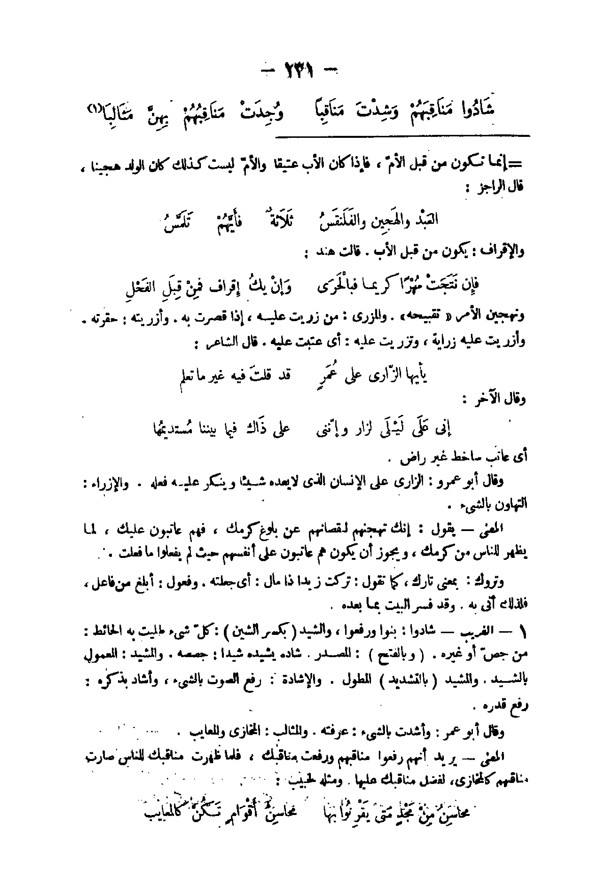 - الْغَرِيب شادوا بنوا وَرفعُوا والشيد بِكَسْر الشين كل شئ طليت بِهِ الْحَائِط من جص أَو غَيره وبالفتح الْمصدر شاده يشيده شيدا جصصه والمشيد الْمَعْمُول بالشيد والمشيد بِالتَّشْدِيدِ المطول والإشادة رفع الصَّوْت بالشئ وأشاد بِذكرِهِ رفع قدره وَقَالَ أَبُو عمر وأشدت بالشئ عَرفته والمثالب المخازى والمعايب الْمَعْنى يُرِيد أَنهم رفعوا مناقبهم وَرفعت مناقبك فَلَمَّا ظَهرت مناقبل للنَّاس صَارَت مناقبهم كالمخازى لفضل مناقبك عَلَيْهَا وَمثله لحبيب