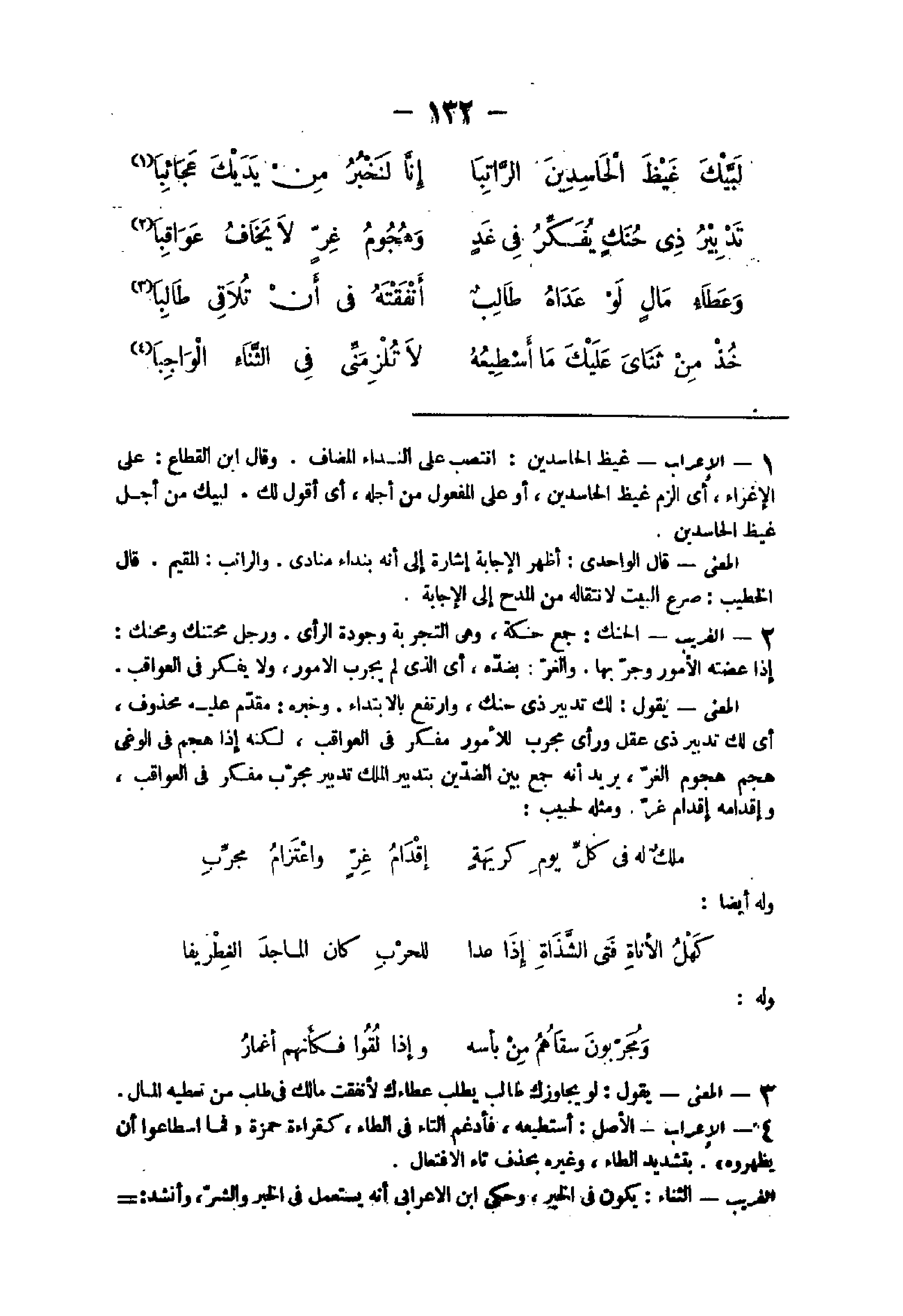 - الْإِعْرَاب غيظ الحاسدين انتصب على النداء الْمُضَاف وَقَالَ ابْن القطاع على الإغراء أى الزم غيظ الحاسدين أَو على الْمَفْعُول من أَجله أى أَقُول لَك لبيْك من أجل غيظ الحاسدين الْمَعْنى قَالَ الواحدى أظهر الْإِجَابَة إِشَارَة إِلَى أَنه بِنِدَاء منادى والراتب الْمُقِيم قَالَ الْخَطِيب صرع الْبَيْت لانتقاله من الْمَدْح إِلَى الْإِجَابَة