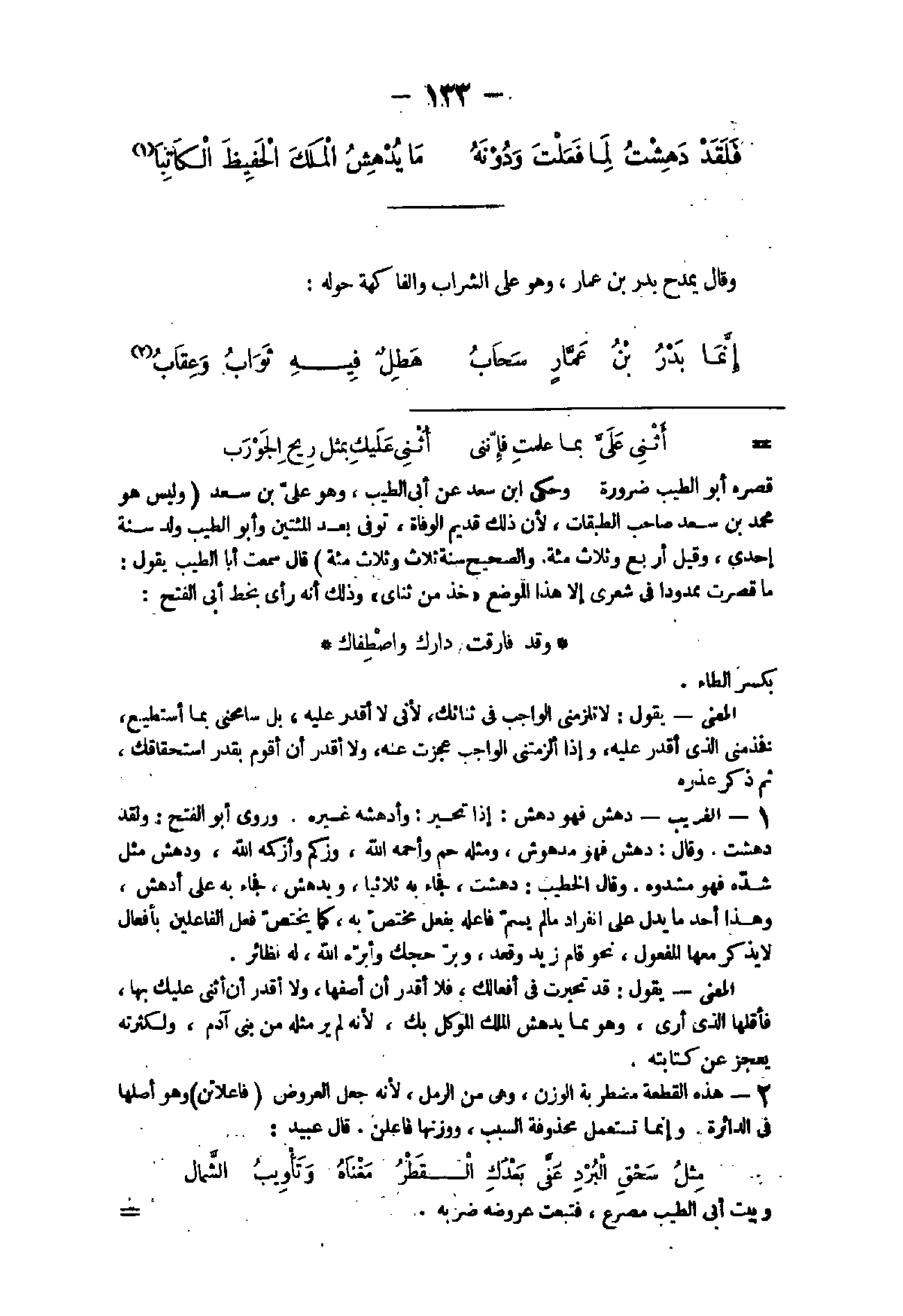 - 1 - هَذِه الْقطعَة مضطربة الْوَزْن وهى من الرمل لِأَنَّهُ جعل الْعرُوض فاعلاتن وَهُوَ أَصْلهَا فى الدائرة وَإِنَّمَا تسْتَعْمل محذوفة السَّبَب وَزنهَا فاعلن قَالَ عبيد