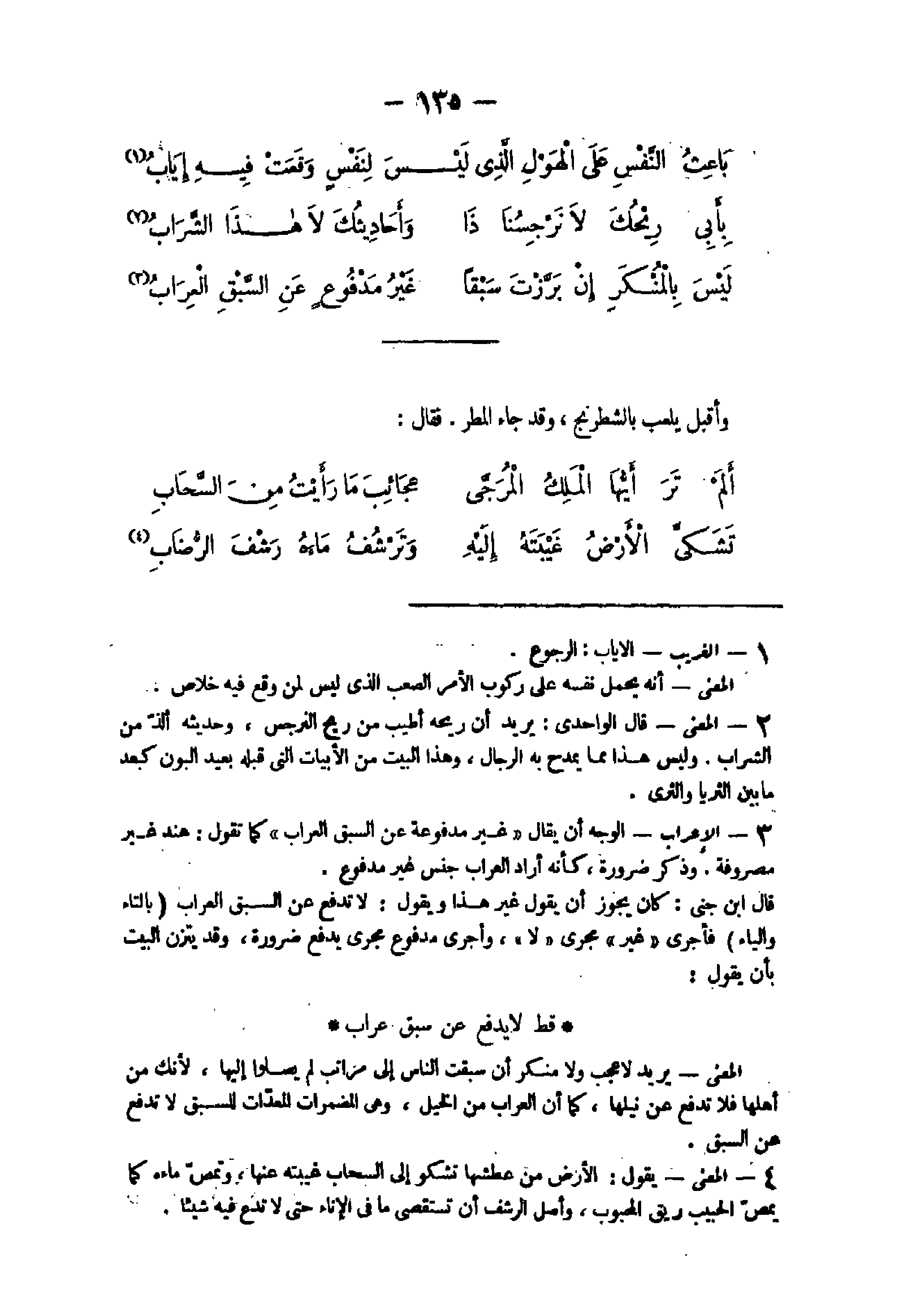 9 - الْإِعْرَاب الْوَجْه أَن يُقَال غير مدفوعة عَن السَّبق العراب كَمَا تَقول هِنْد غير مصروفة وَذكر ضَرُورَة كَأَنَّهُ أَرَادَ العراب جنس غير مَدْفُوع قَالَ ابْن جنى كَانَ يجوز أَن يَقُول غير هَذَا وَيَقُول