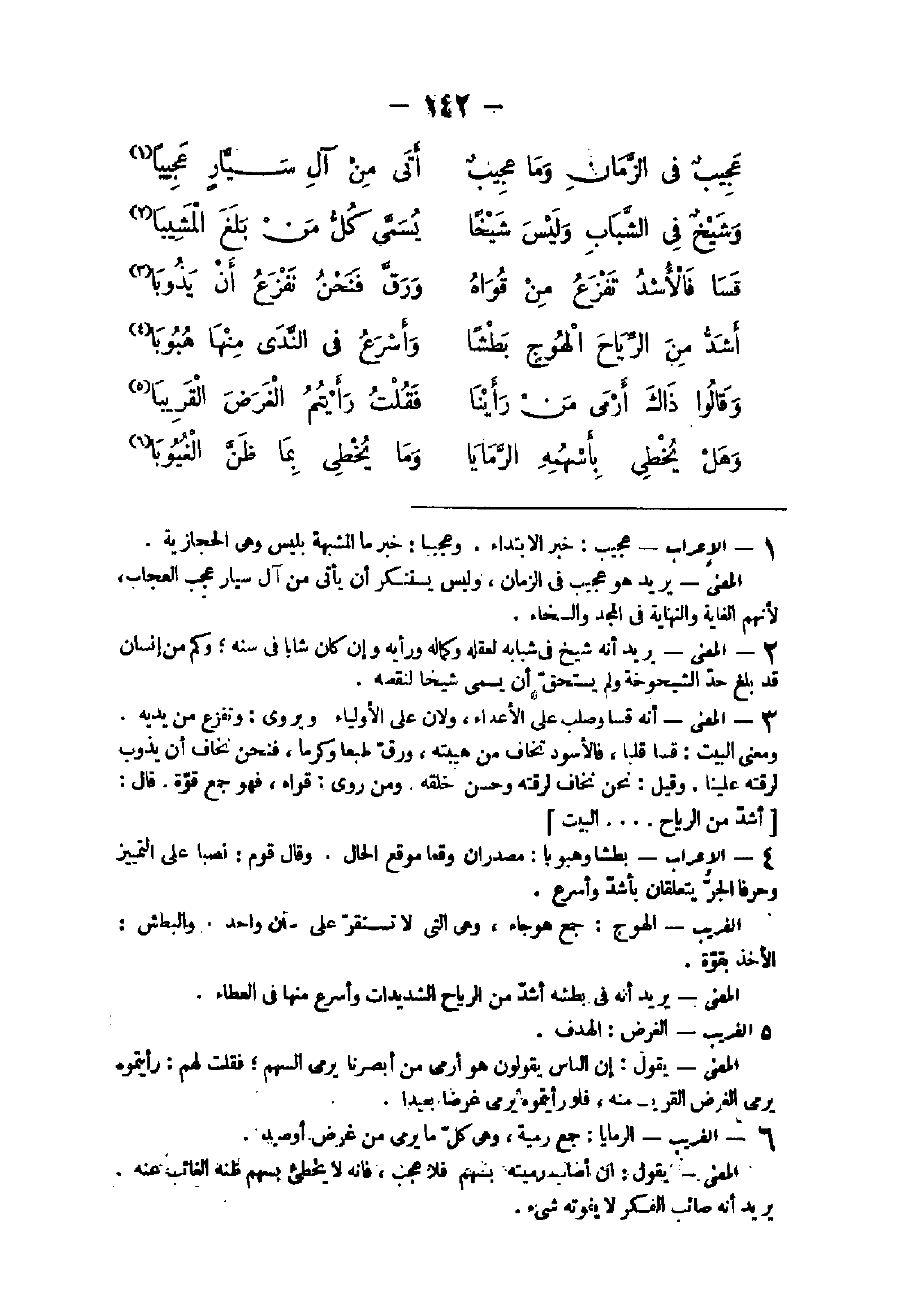 - الْإِعْرَاب عَجِيب خبر الِابْتِدَاء وعجيبا خبر المشبهة بليس وهى الحجازية الْمَعْنى يُرِيد هُوَ عَجِيب فى الزَّمَان وَلَيْسَ يستنكر أَن يأتى من آل سيار عجب العجاب لأَنهم الْغَايَة وَالنِّهَايَة فى الْمجد والسخاء