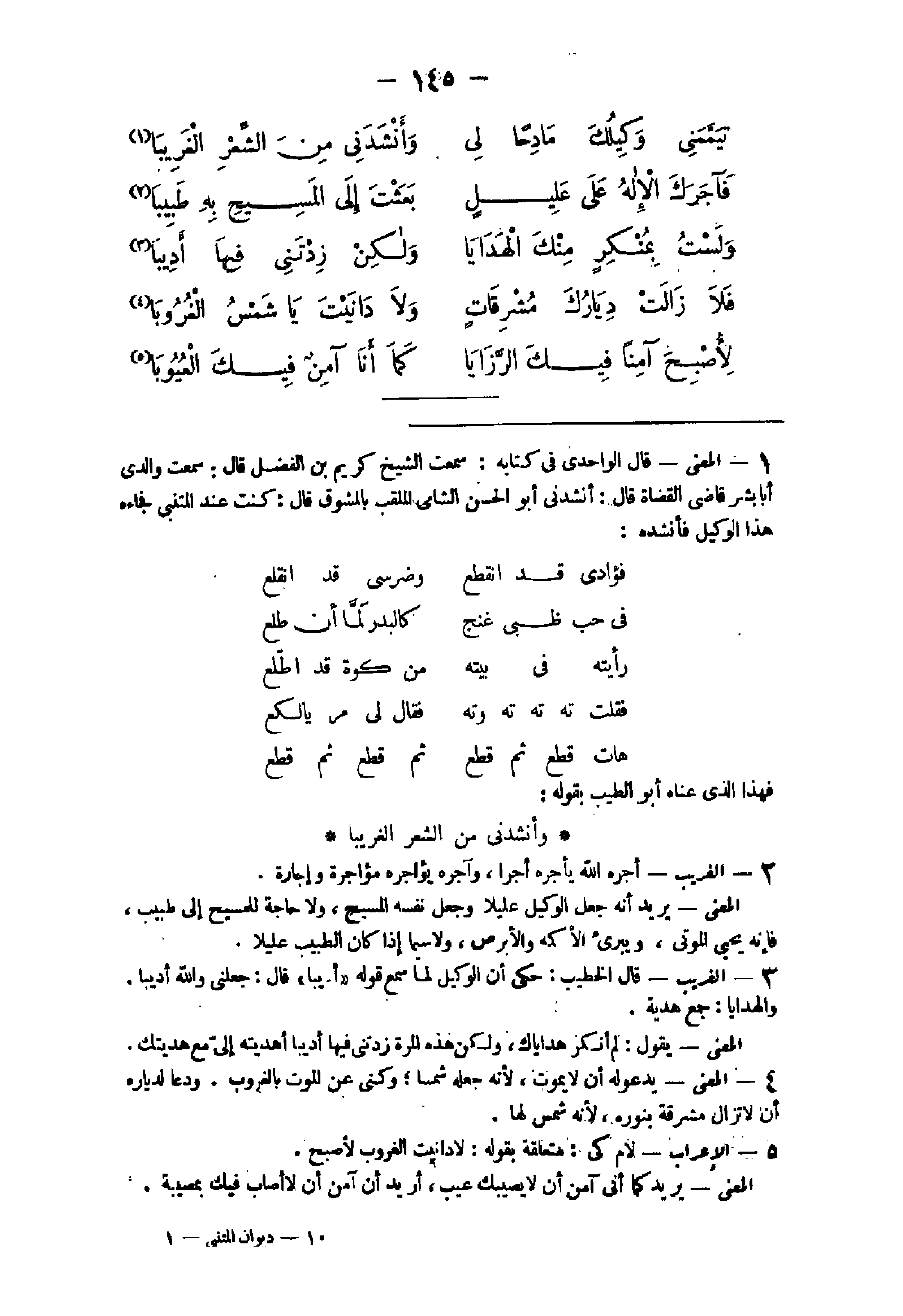 - الْمَعْنى قَالَ الواحدى فى كِتَابه سَمِعت الشَّيْخ كريم بن الْفضل قَالَ سَمِعت والدى أَبَا بشر قاضى الْقُضَاة قَالَ أنشدنى أَبُو الْحُسَيْن الشامى الملقب بالمشوق قَالَ كنت عِنْد المتنبى فَجَاءَهُ هَذَا الْوَكِيل فأنشده