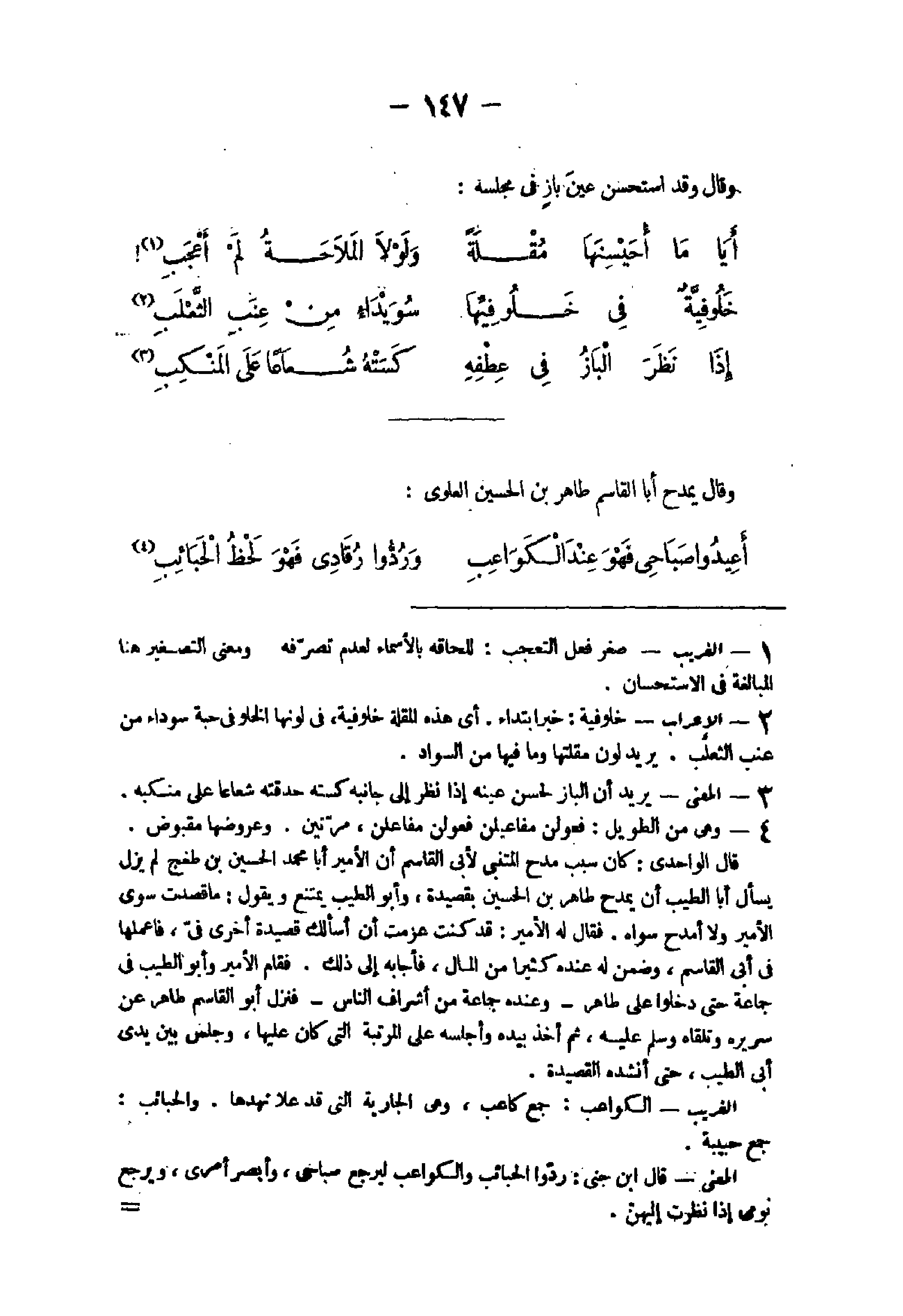 - 1 - وهى من الطَّوِيل فعولن مفاعيلن فعولن مفاعلن مرَّتَيْنِ وعروضها مَقْبُوض قَالَ الواحدى كَانَ سَبَب مدح المتنبى لأبى الْقَاسِم أَن الْأَمِير أَبَا مُحَمَّد الْحُسَيْن بن طغج لم يزل يسْأَل أَبَا الطّيب أَن يمدح طَاهِر بن الْحُسَيْن بقصيدة وَأَبُو الطّيب يمْتَنع وَيَقُول مَا قصدت سوى الْأَمِير وَلَا أمدح سواهُ فَقَالَ لَهُ الْأَمِير قد كنت عزمت أَن أَسأَلك قصيدة أُخْرَى فى فاعملها فى أَبى الْقَاسِم وَضمن لَهُ عِنْده كثيرا من المَال فَأَجَابَهُ إِلَى ذَلِك فَقَامَ الْأَمِير وَأَبُو الطّيب فى جمَاعَة حَتَّى دخلُوا على طَاهِر وَعِنْده جمَاعَة من أَشْرَاف النَّاس فَنزل أَبُو الْقَاسِم طَاهِر عَن سَرِيره وتلقاه وَسلم عَلَيْهِ ثمَّ أَخذ بِيَدِهِ وَأَجْلسهُ على الْمرتبَة الَّتِى كَانَ عَلَيْهَا وَجلسَ بَين يدى أَبى الطّيب حَتَّى أنْشدهُ القصيدة الْغَرِيب الكواعب جمع كاعب وهى الْجَارِيَة الَّتِى قد علا نهدها والحبائب جمع حَبِيبَة الْمَعْنى قَالَ ابْن جنى ردوا الحبائب والكواعب ليرْجع صباحى وَأبْصر أمرى وَيرجع نومى إِذا نظرت إلَيْهِنَّ وَقَالَ ابْن فورجة دهرى ليلى كُله وَلَا صباح لى إِلَّا وجوههن وليلى سهر كُله وَلَا رقاد لى حَتَّى أراهن